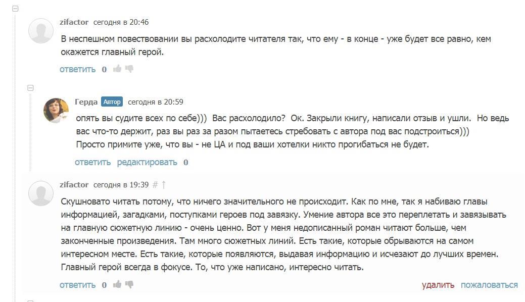 В общем, ребята судорожно ищут привычный, удобный для анализа, знакомый шаблон. И не находят. Дело осложняется тем, что многотомник не закончен. Есть зачин и экспозиция и на этом все. И выходит, людям банально не хватает либо знания что не усредненным шаблоном, либо желания услышать и слушать автора, когда он говорит, что попасть в привычный (и наиболее распространенный) шаблон цели и не стояло. Для этих людей других форм, кроме привычной нет и не существовало и существовать не может. Для меня они есть. Для меня вернуться к привычному шаблону - это сделать десяток шагов назад и регрессировать. Отказаться от наработок, просто потому что для самозванных "экспертов" оно лежит в области, которую трогать "нельзя".