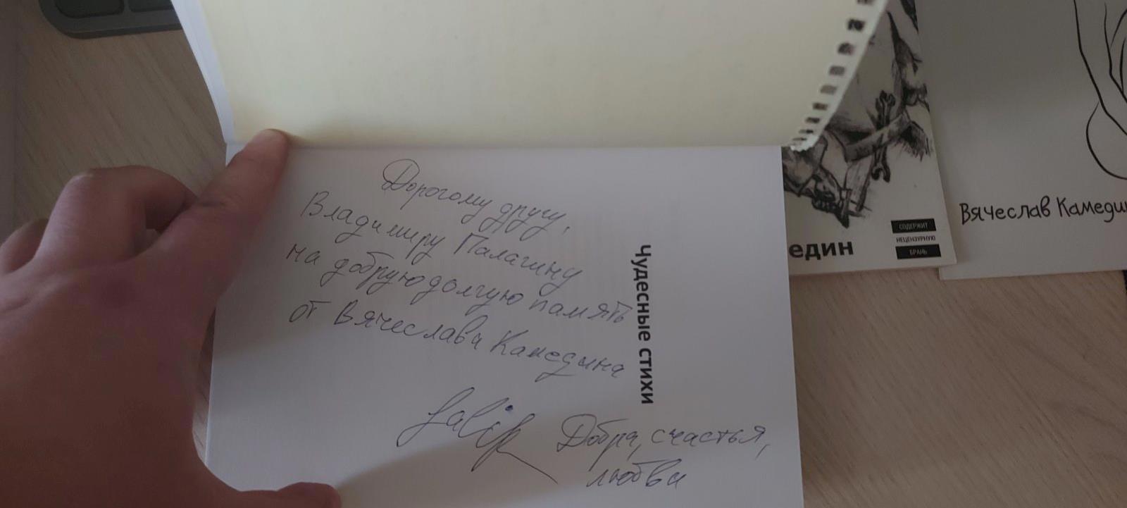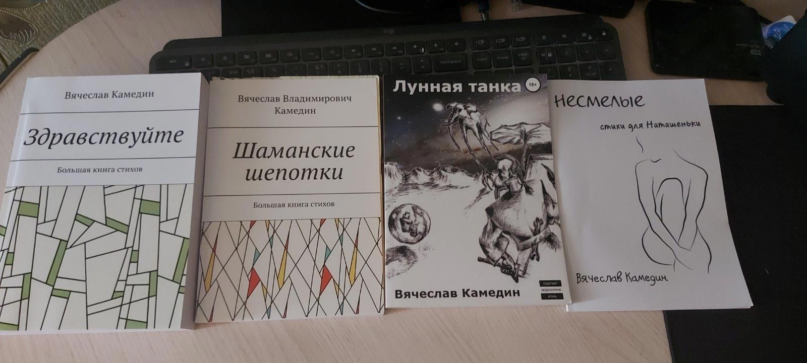 А еще, ну, тут уже похвастаюсь, у меня теперь есть аж 4 книги от моего друга, земляка Вячеслава Камедина, музыканта, прозаика, поэта, переводчика и психолога. Его музыка и стихи пронзительны и очень искренни! (Живет он здесь: https://vk.com/vyacheslav.kamedin)