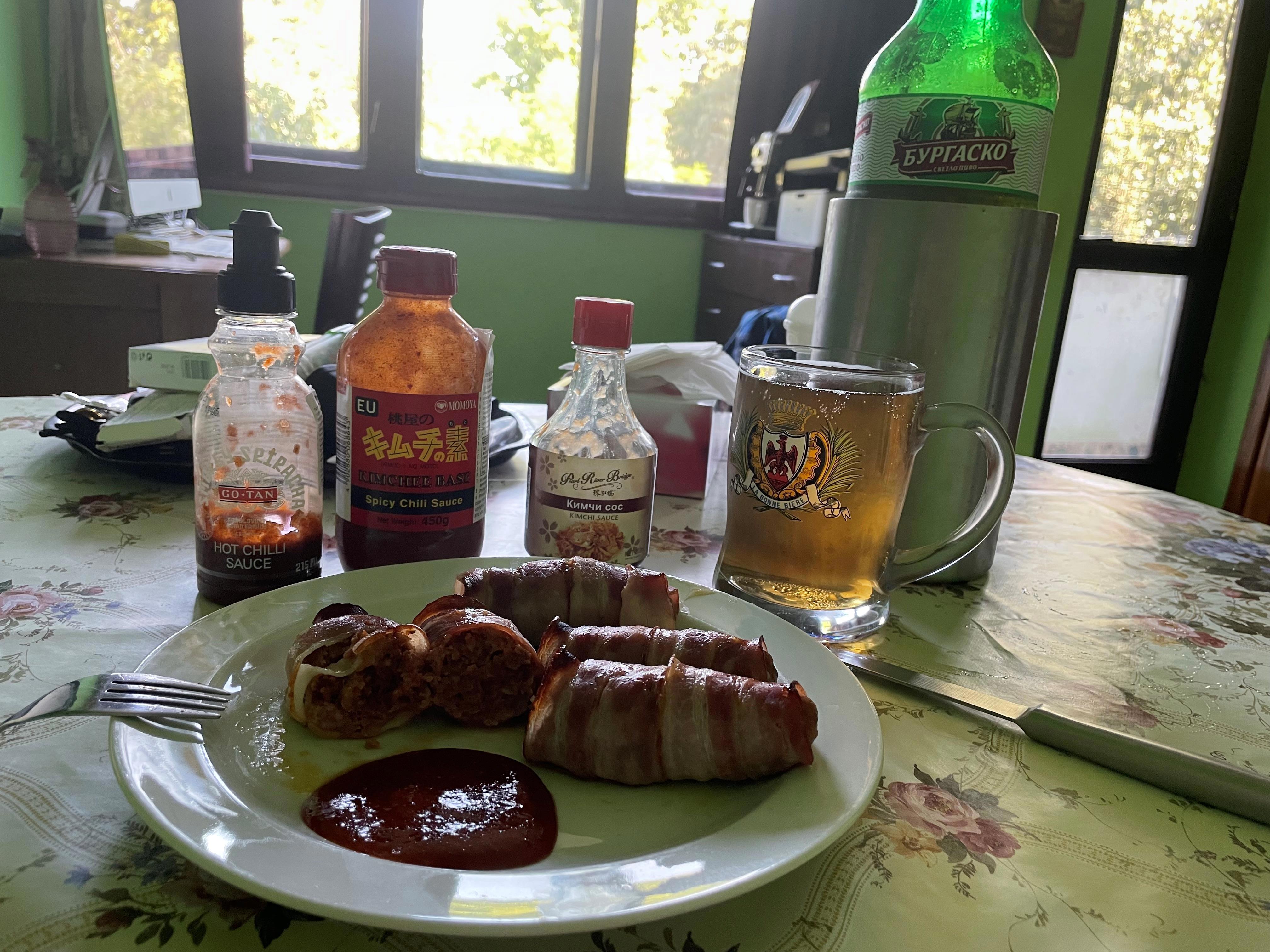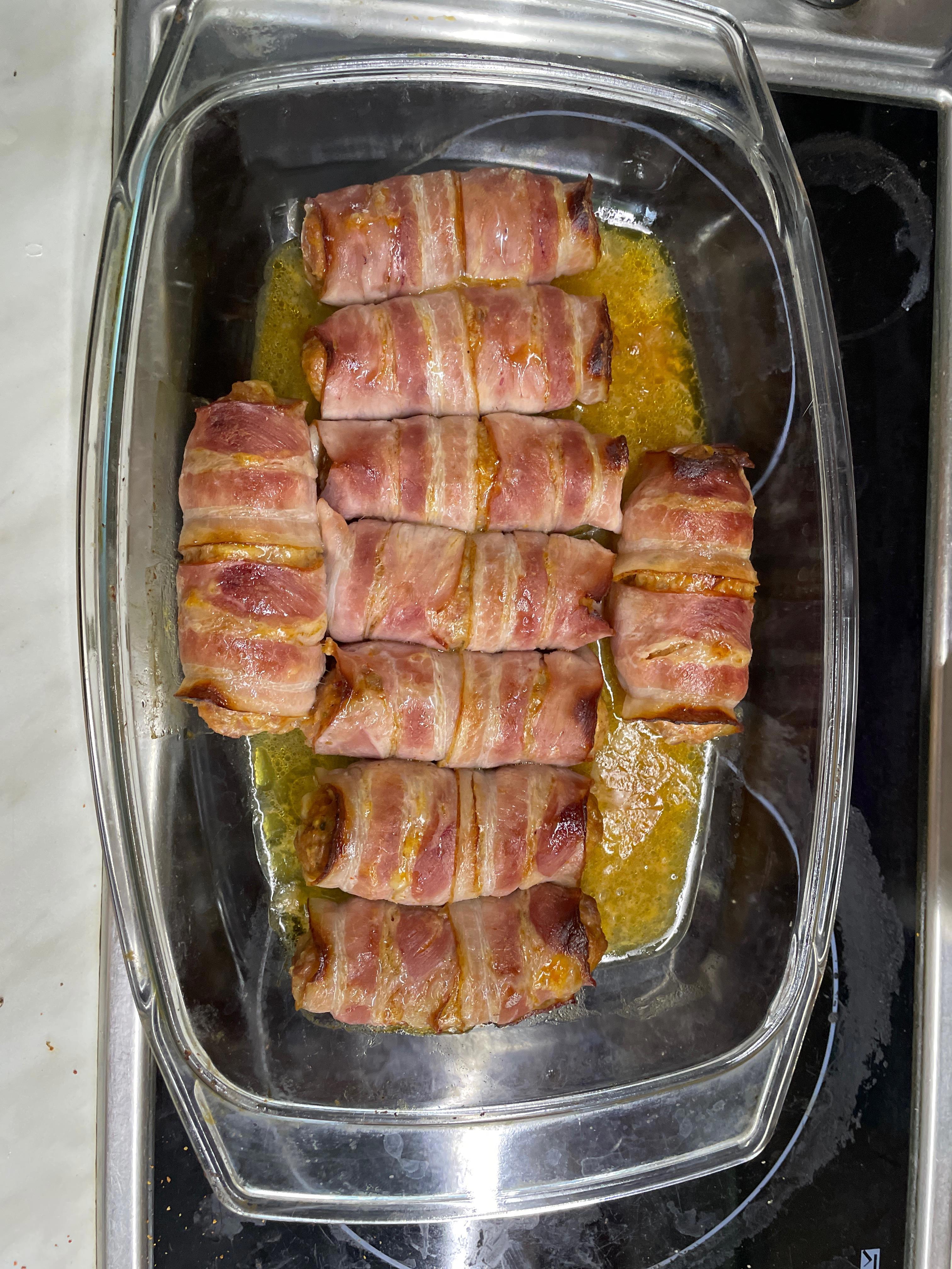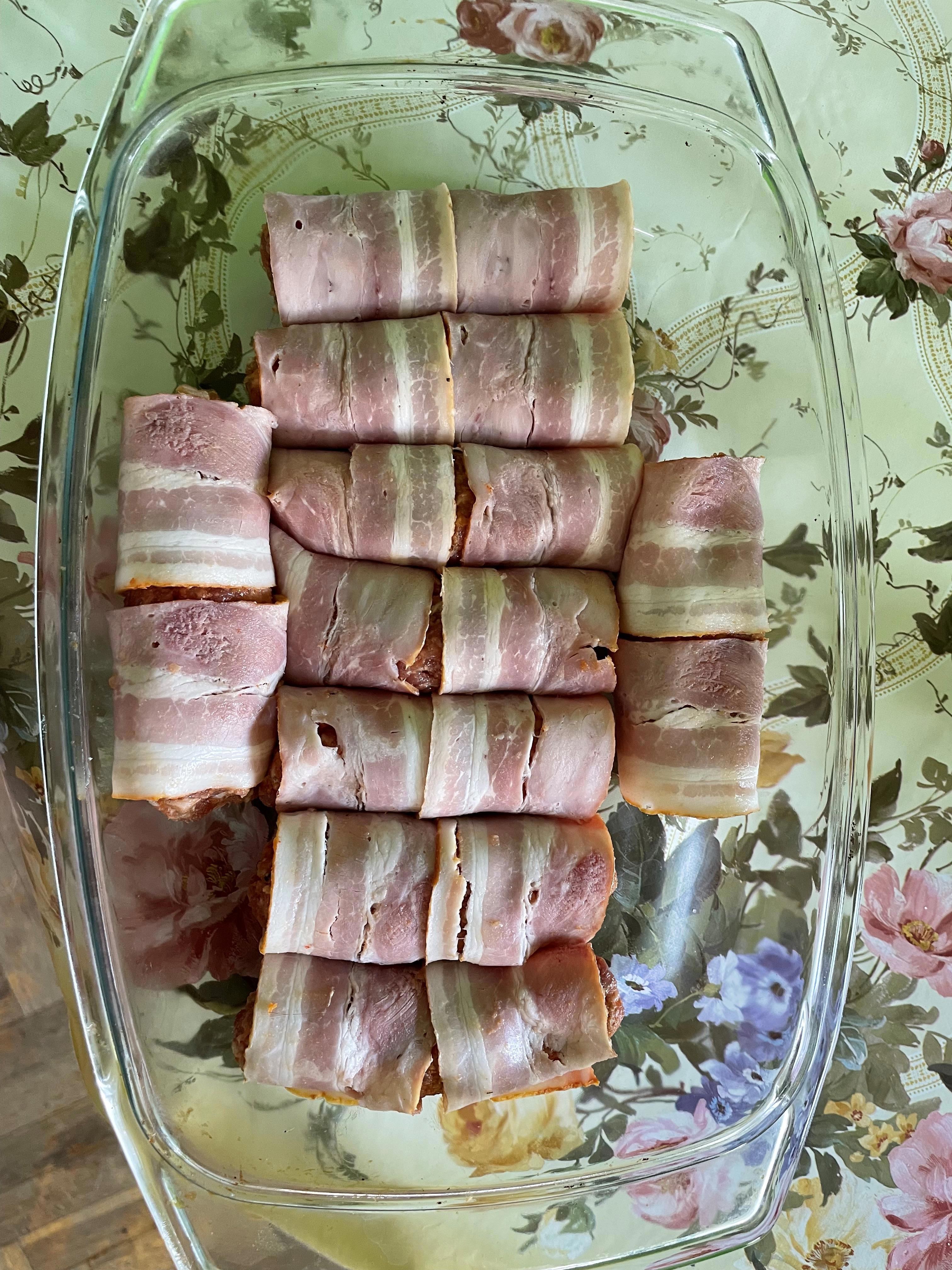 Скатал из фарша колбаски, каждую завернул в два ломтика бекона. И -- в духовку 180 градусов на 30 минут