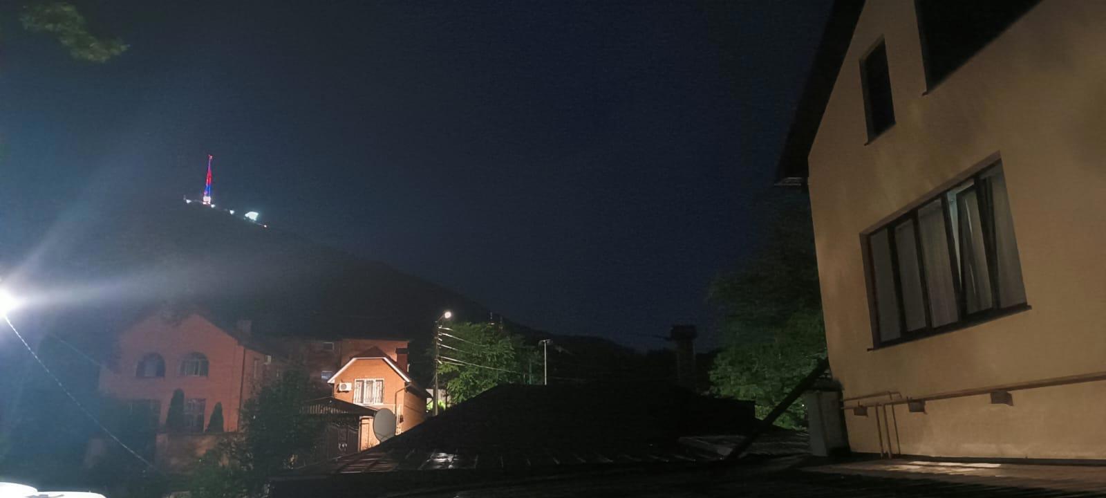 Уже дома, когда прошел дождь, я сфотографировала из окна гору Машук с телебашней на ее вершине. Но фонарь возле дома не дал сделать качественный снимок. А я очень люблю смотреть в это окно. Башня переливается разными огоньками и кажется, что везде спокойно и красиво, и мир во всем мире...