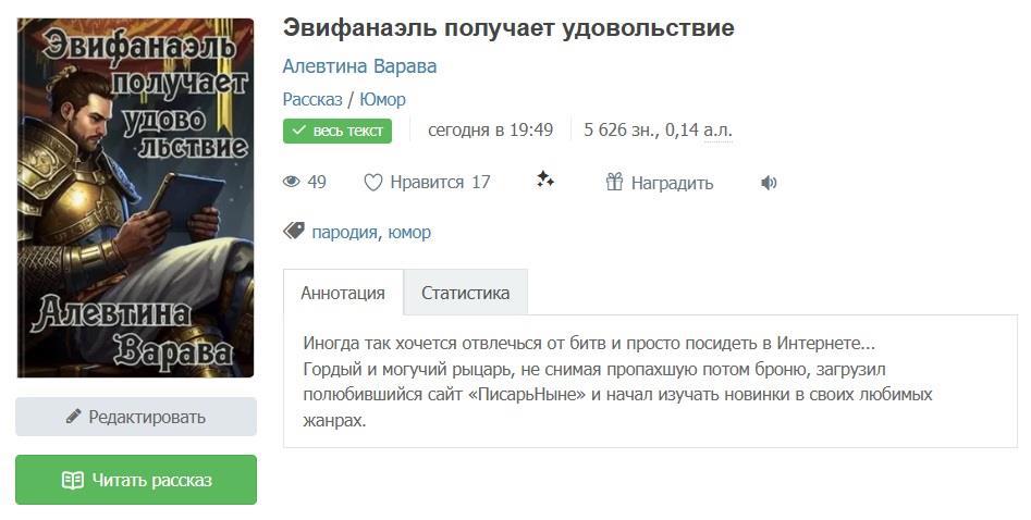 Гордый и могучий рыцарь, не снимая пропахшую потом броню, загрузил полюбившийся сайт «ПисарьНыне» и начал изучать новинки в своих любимых жанрах.