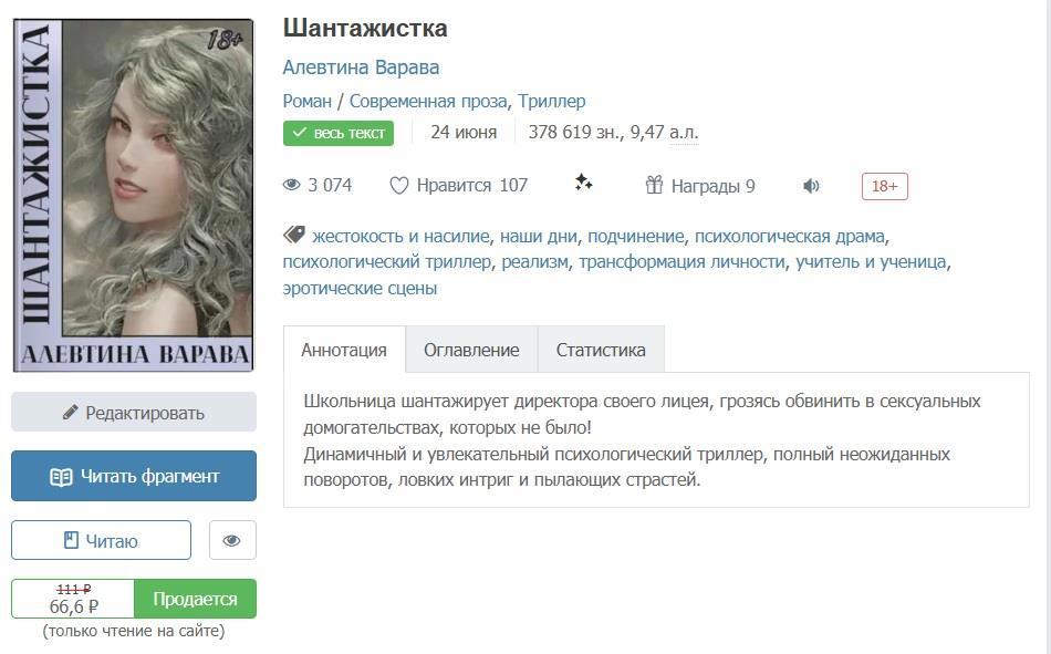 Автор: Алевтина ВараваЭто совсем не лёгкая история. В ней нет магии и мистики. Только человеческая драма. Директора школы шантажирует ловкая девятиклассница. Грозится выставить педофилом, хотя он не имел даже понятия о её существовании до дня, когда она разыграла свой спектакль. Герой, уверенный в своей праведности и честности, постепенно увязает в болоте всё глубже. Трусость и страх затягивают его в бездну. Ловкая маленькая стерва очень находчива. История динамичная, события сменяются с каждой главой, и временами дают неожиданный крен. Поглядеть, как проходит все круги ада солидный директор элитной московской гимназии сейчас можно всего за 66,6.