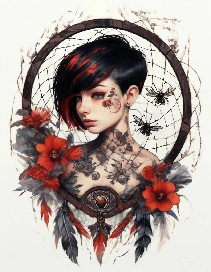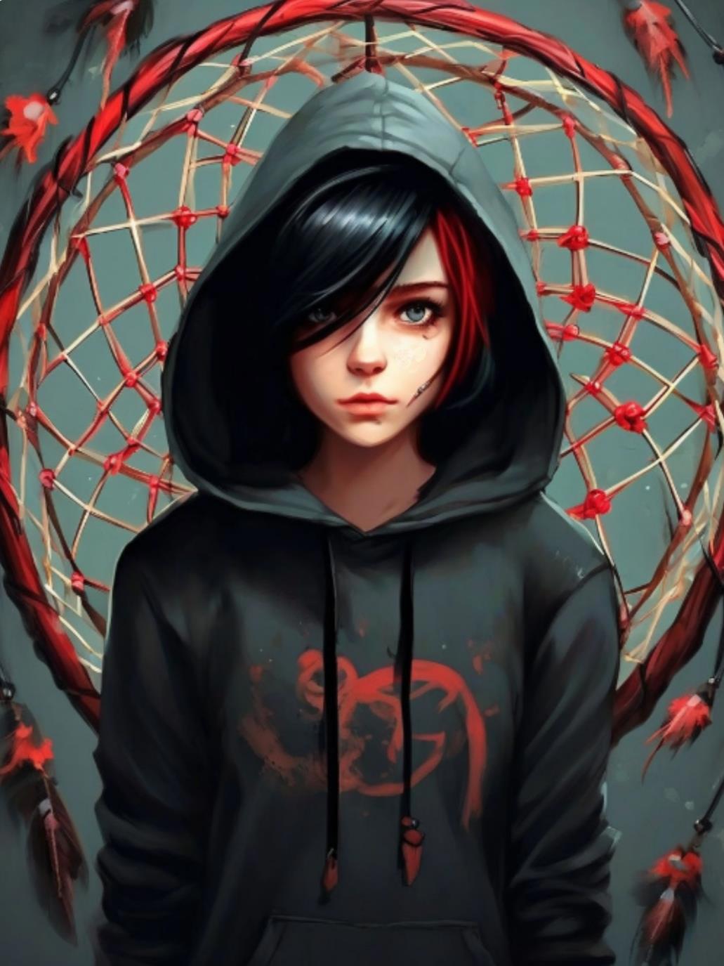 Внешность: рост 155 см, 45 кг, лохматое чëрное каре с двумя красными прядями по бокам, одевается в оверсайз (ну или готишно-эротишно, когда выступает). В районе ключиц у Кары набиты татуировки в виде насекомых, запутавшихся в паутине. Каждое насекомое обозначает... Нет, не буду спойлерить~