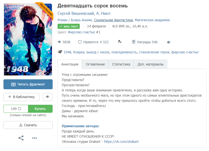 Я ##### совсем, фантазия отсутствует напрочь, а чувство юмора попало под санкции. Хотя портальчик и так уже благополучно занимает нишу книг для совсем уж школоты, так что чё удивляться.