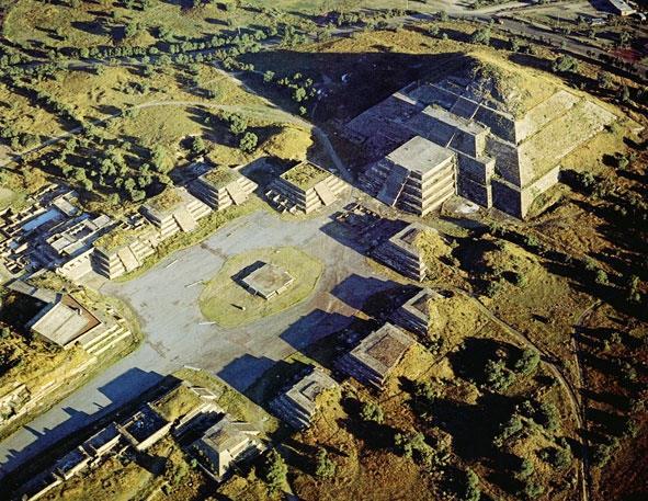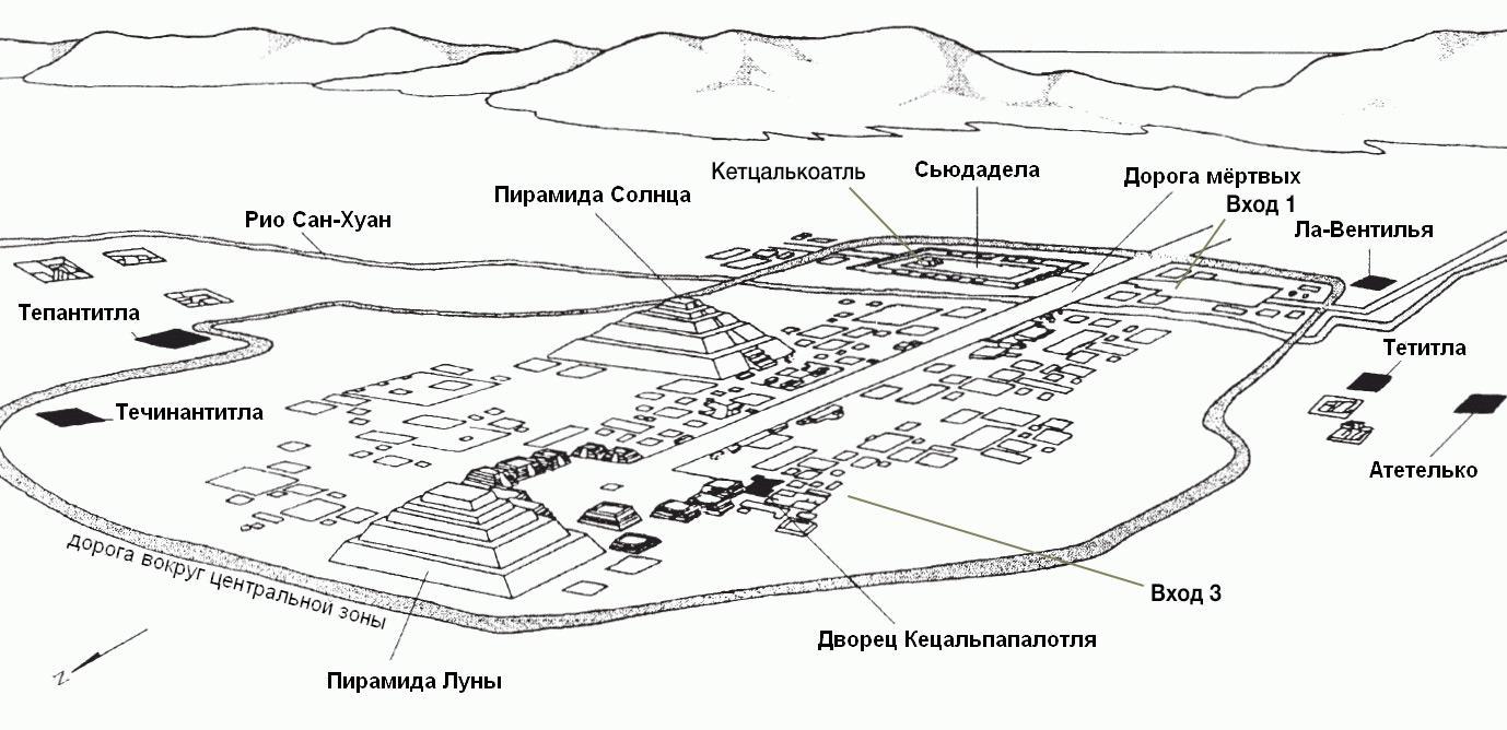 Две пересекающиеся под прямым углом широкие улицы сформировали центр, в котором сосредоточено 18 пирамид. В плане весь комплекс выстроен вдоль одной из них – «бульвара» шириной 40–45 метров и длиной около 5 километров, который ацтеки называли Мишкоатли – «Дорога Мертвых». Есть много оснований полагать, что когда-то он представлял собой систему сообщающихся прудов с необходимыми шлюзами и другими гидравлическими механизмами. Этот «бульвар», идущий с юго-запада на северо-восток, начинается у так называемой Цитадели с заключенной в ней пирамидой Кецалькоатля и приводит к пирамиде Луны. Его уровень в конце на 27 метров выше, чем в начале, у Цитадели. Немного восточнее него, точно на одной линии с Цитаделью, расположена самая высокая пирамида Америки – пирамида Солнца. Конечно, это не первоначальные названия пирамид, они также были даны ацтеками, которые удивлялись их красоте и величию.