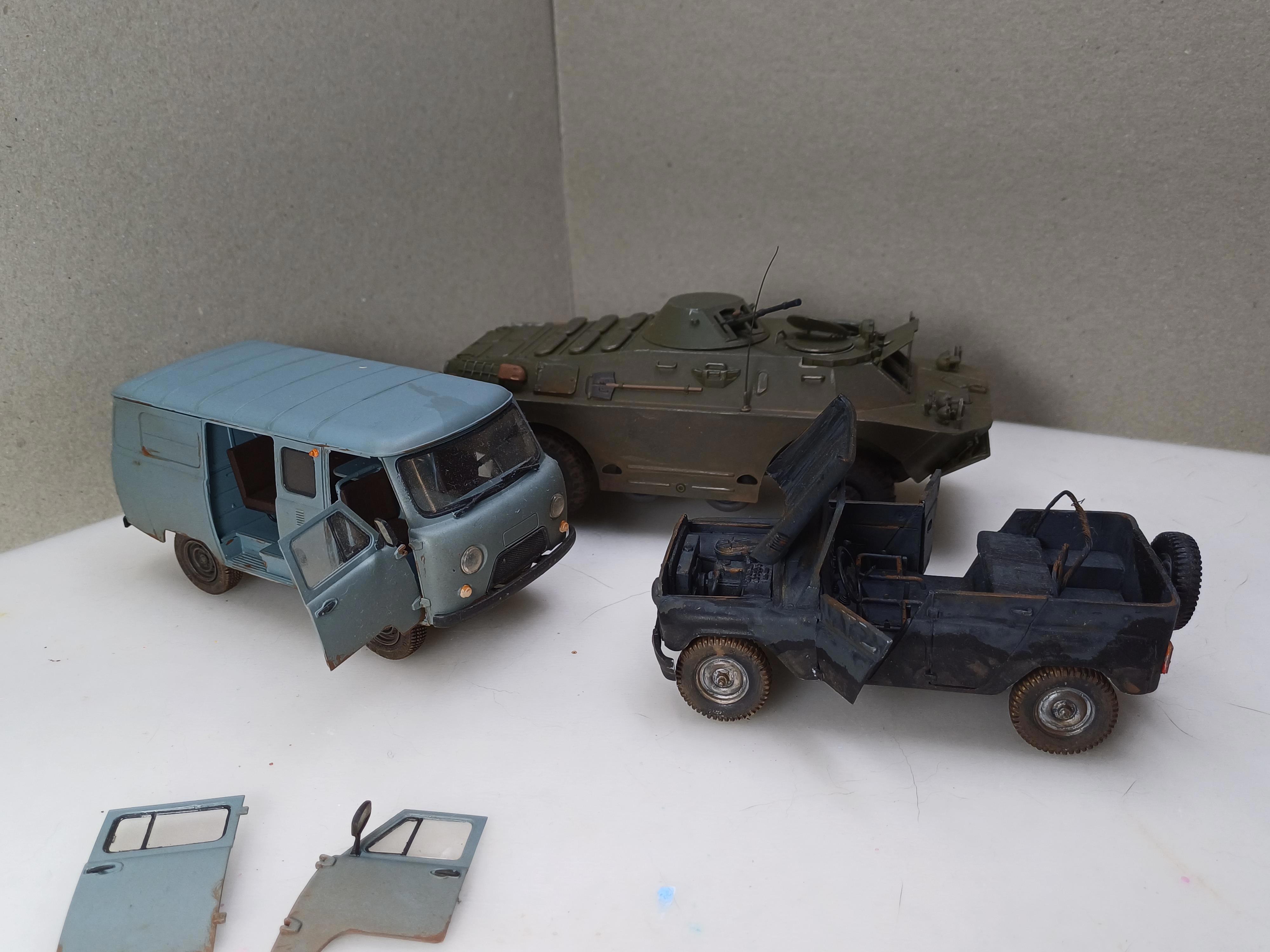 Основанием будет заросшая грунтовка с колеёй. На задний план всобачим покосившуюся ограду того-самого-дома, на переднем можно поставить дерево (у меня еще есть парочка) или два-три куста. Одного человека - в люк БРДМ, пару в свободных позах - между машинами, ну и слева, перед "буханкой" - сцену допроса колдунов. Если получится.