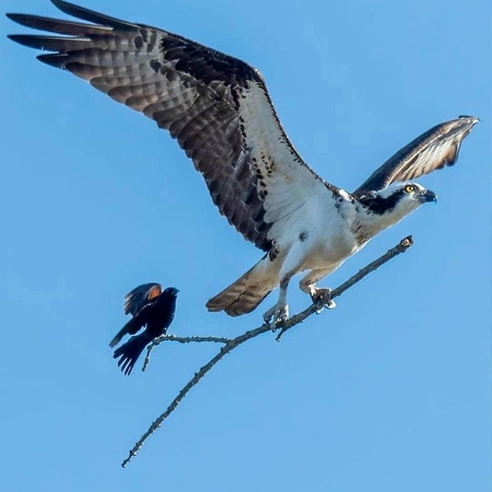 Это рисовый или эполетовый трупиал. Одна из самых многочисленных птиц Америки, в массе гнездится в зарослях тростника и других околоводных растений. В отличие от дроздов, этот трупиал обычен по соседству со скопой. Так что их жизненные пути запросто могут пересечься, пусть даже таким причудливым образом.