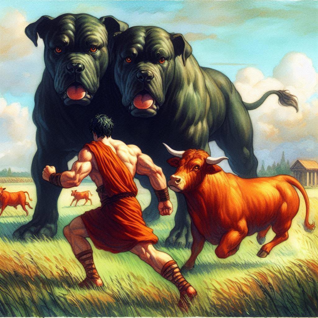 Коровы Гериона. На поле выходит чудовищный пёс Орф - родной брат Цербера, от своей же маменьки породивший Сфинкс и Немейского льва; впрочем, здесь у него отпуск, он всего лишь пасёт коров. Геракл вынужден совершить пробежку.