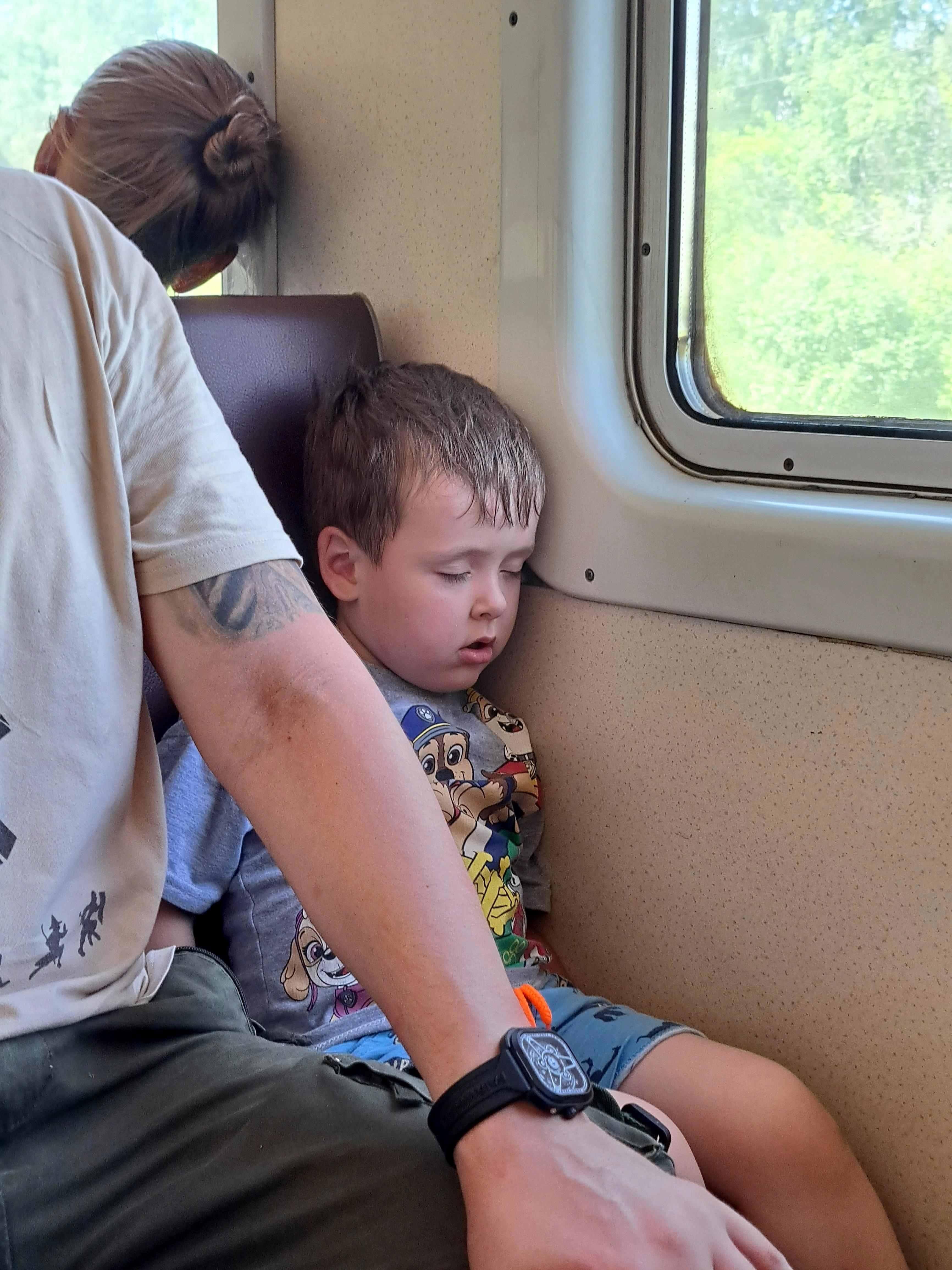 Дорога в электричке, пока есть Интернет мама занимается языками, а детёныш помогает