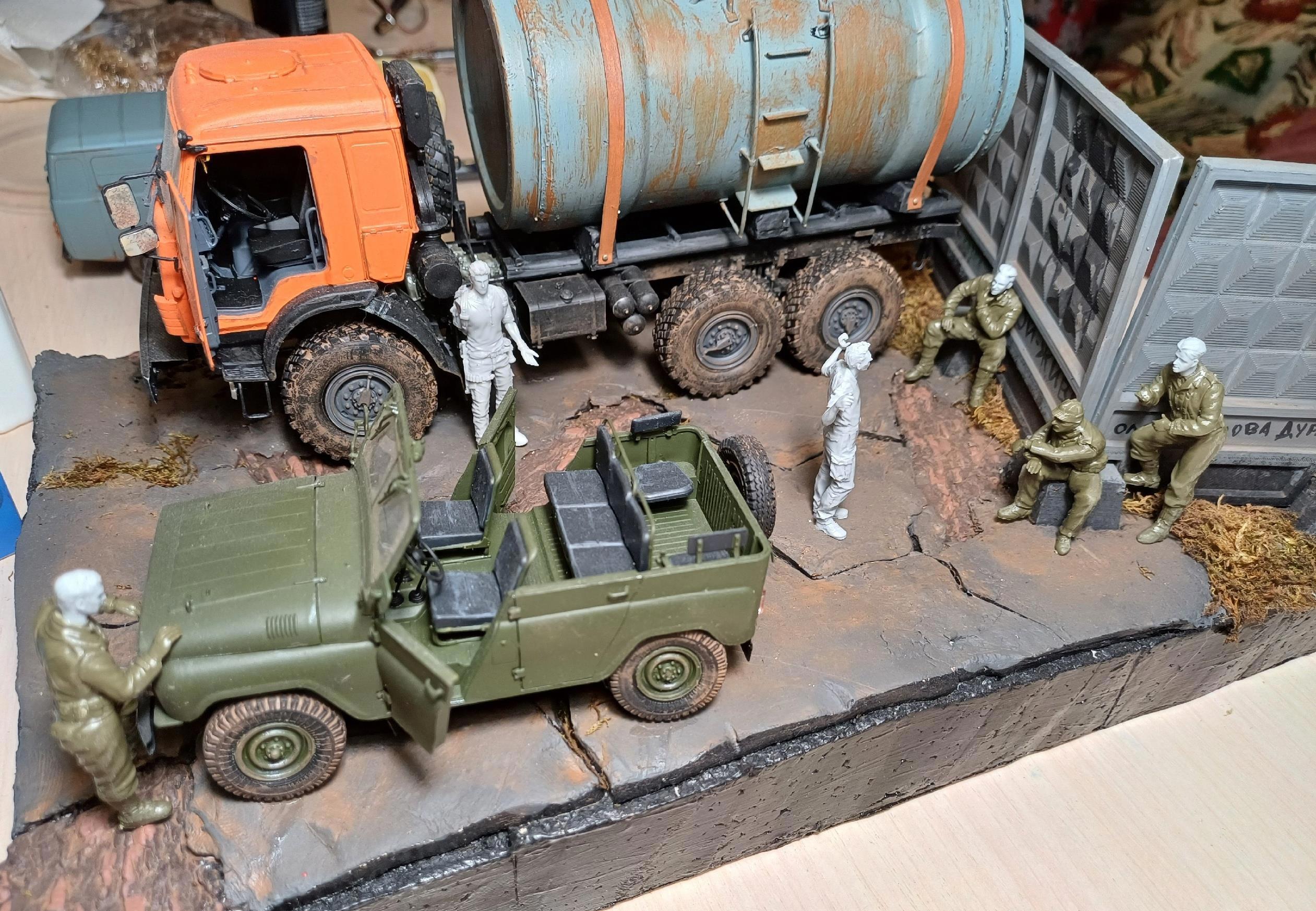Камаз и УАЗ поставлены и вклеены на свои места, фигурки собраны и прикинута их расстановка. Зеленые - бывшая американская боевая группа от Tamia, с китайскими головами с алиэкспресса, серые - "выживальщики" всё с того же алика, которые тут будут играть роль водителей наливняка: