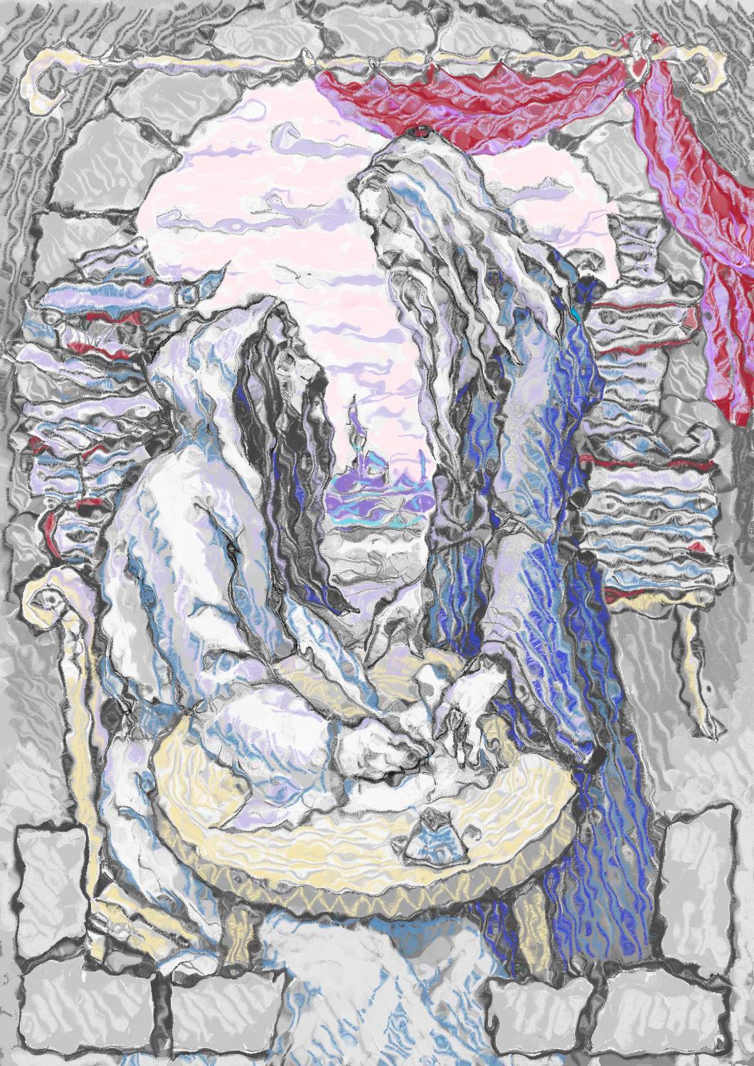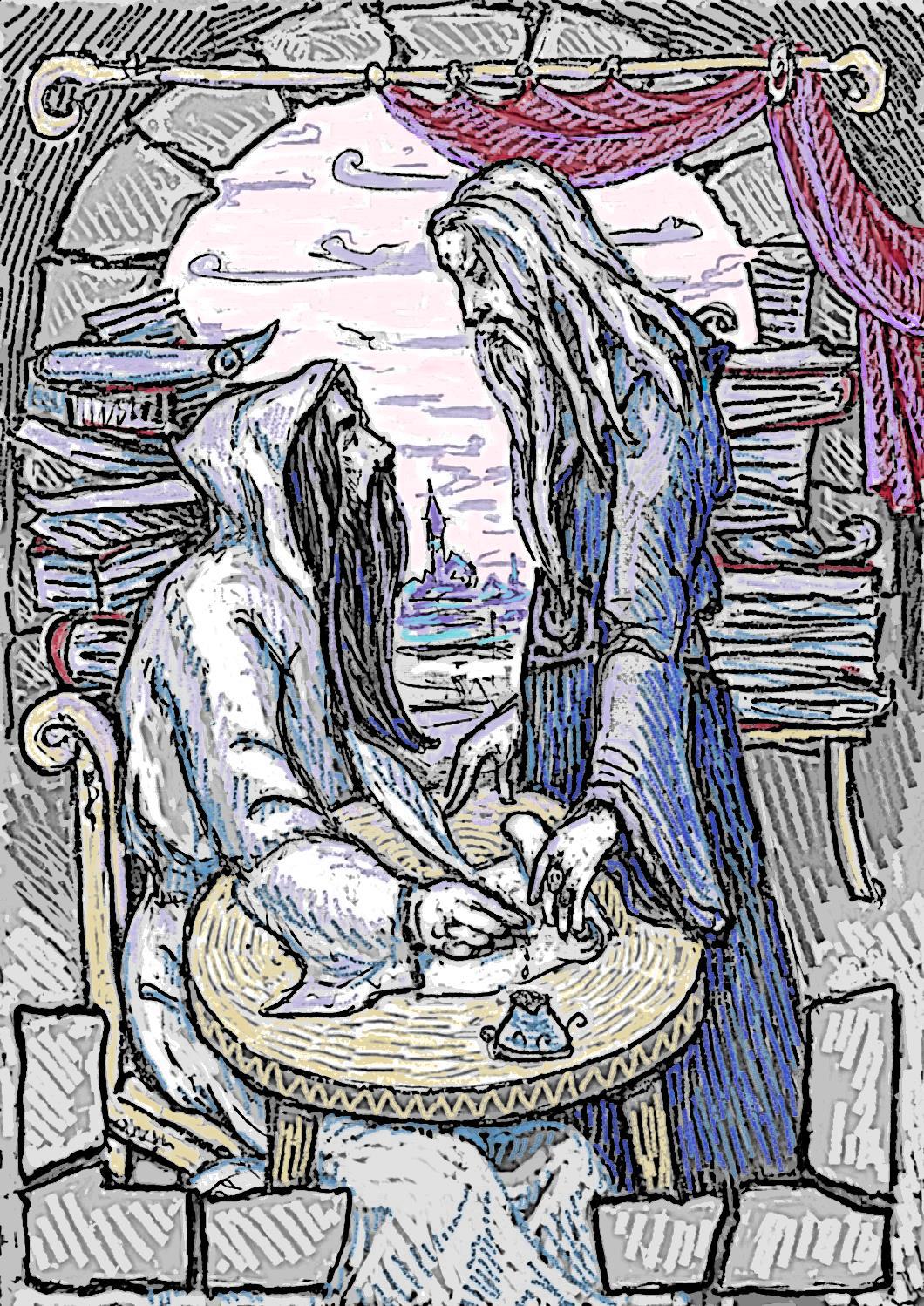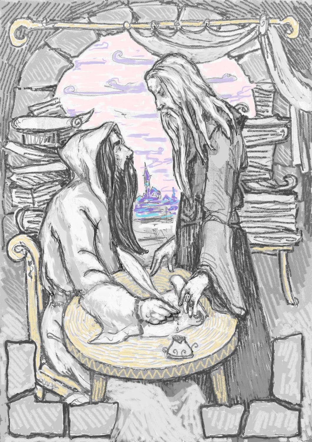 Сама же я рисовала для Daria Sogrina-Druc "Кхаа Тэ" и изобразила двух магов-близнецов. Ну, как близнецов, один с чёрными волосами и бородой, в белой одежде, второй с белоснежными, в мантии из синего бархата. И политические цели у них были противоположны, насколько я успела понять)) Но момент их встречи в книге был очень красочно описан))
