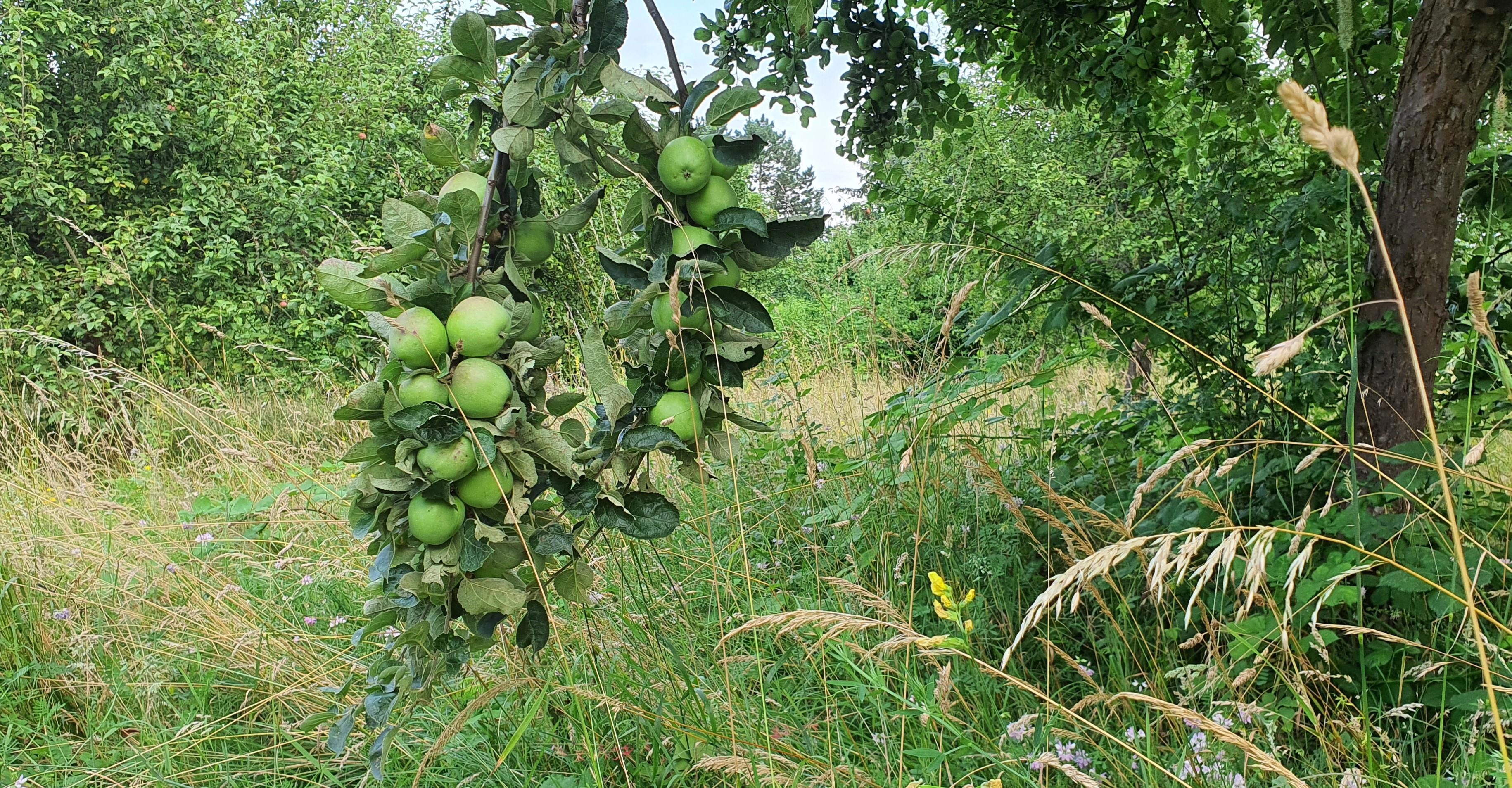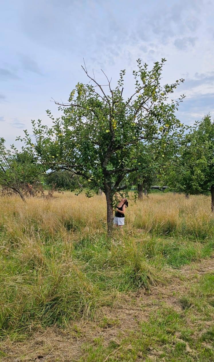 К сожалению тыблоки ещё не созрели, но вот там где инопланетянка пытается сорвать, уже съедобные. Из всей яблочной рощи, это единственная яблоня раннего сорта. Есть ещё и груши, но тоже тока ещё растут.