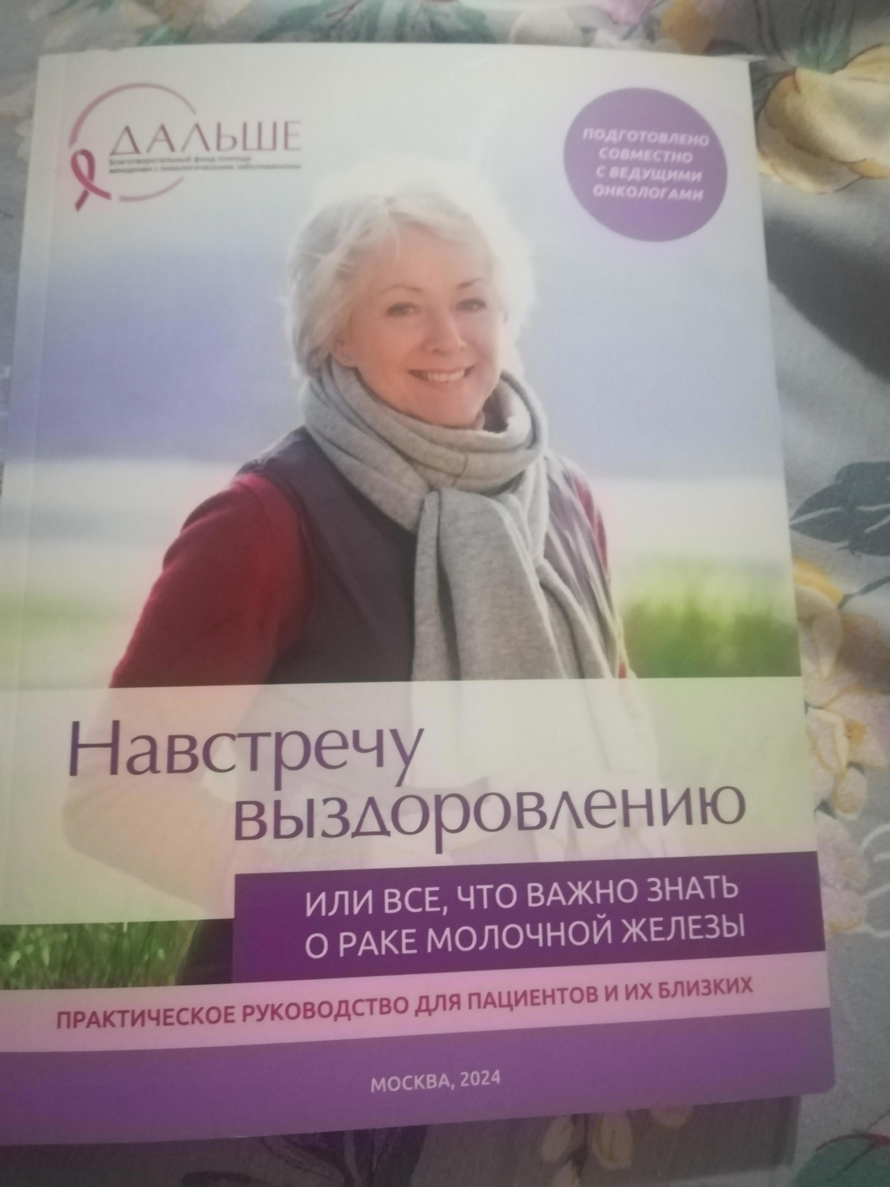 Пока она сидела у врача, попросила для нее книгу на ресепшене Практическое руководство для пациентов и близких "Навстречу выздоровлению или все, что важно знать о раке молочной железы". У меня тоже такая есть. Это проект благотворительного фонда "Дальше" вместе с Минздравом Московской области и ГБУЗ Московской области "Люберецкая областная больница" при поддержке Фонда президентских грантов. На vmesteplus.ru в Информационных материалах эта электронная книга есть в доступе. Только нужно зарегистрироваться на сайте.