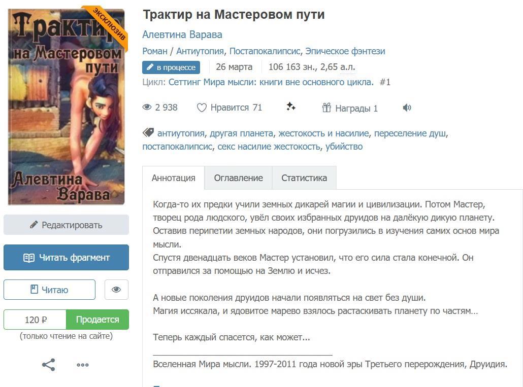 Автор: Алевтина ВараваНа этой планете живут только люди. Но у части из них нет души. Используемые в качестве скота, хотя внешне не отличимые от других, бездушки давно стали привычной реальностью для Друидии. Когда-то предки друидов обучили земные народы магии и цивилизации, а потом отбыли на далёкую планету на отшибе Галактики I-го измерения. Величайшие учёные углубились в науку, а их учитель и творец пропустил, вглядываясь в частное, глобальную катастрофу. Его сила стала конечной. Она сходит на нет. И сотворённый им мир начинает рассыпаться, разъедаемый ядовитым маревом.