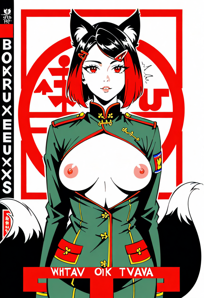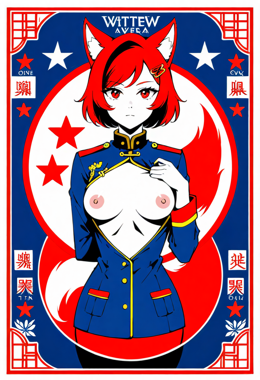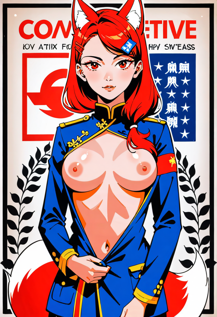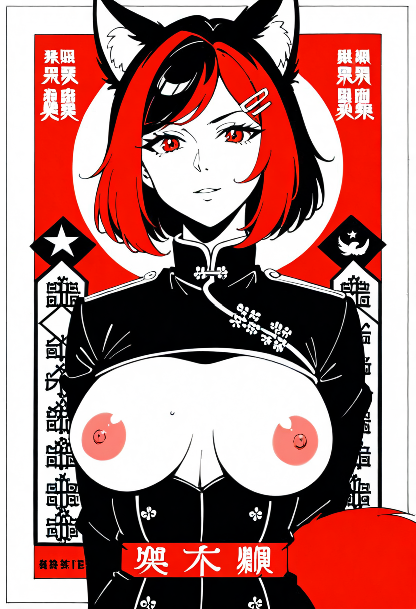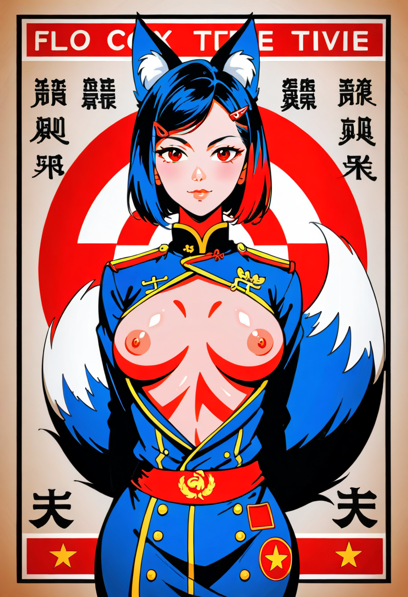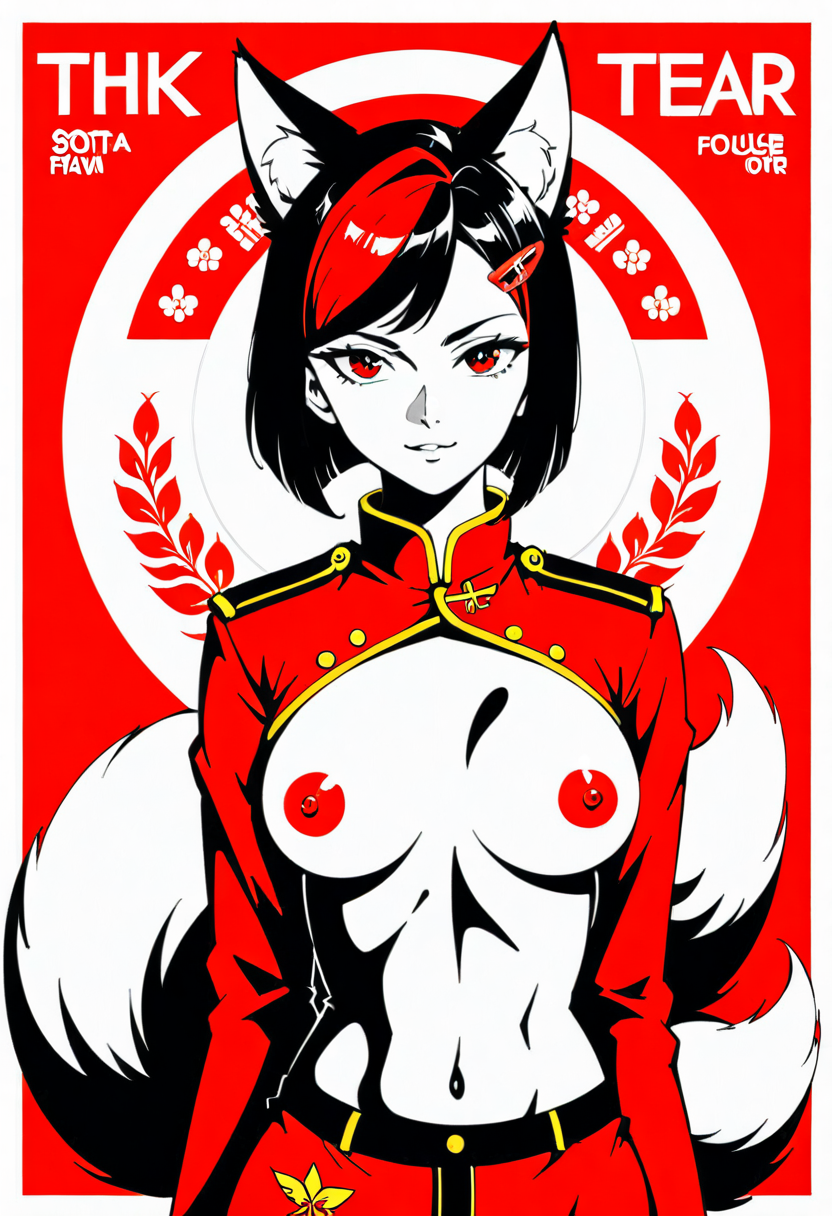 Firefox-Skollie, red eyes, china fox girl, fox tail, multiple tail, multicolored hair, 1girl, hairclip, hair covers ears, solo, medium breasts, looking at viewer, nsfw, cccpposter, sovietposter, soviet poster, China, China poster, soviet, red monochrome, propaganda poster, military uniform