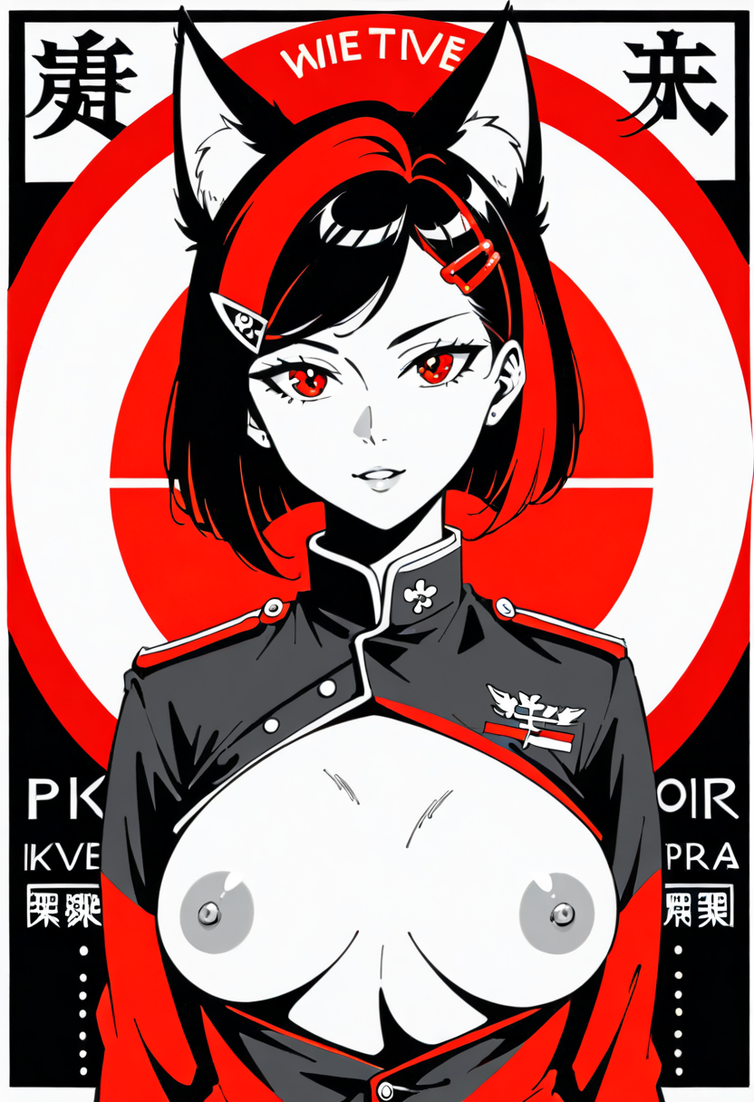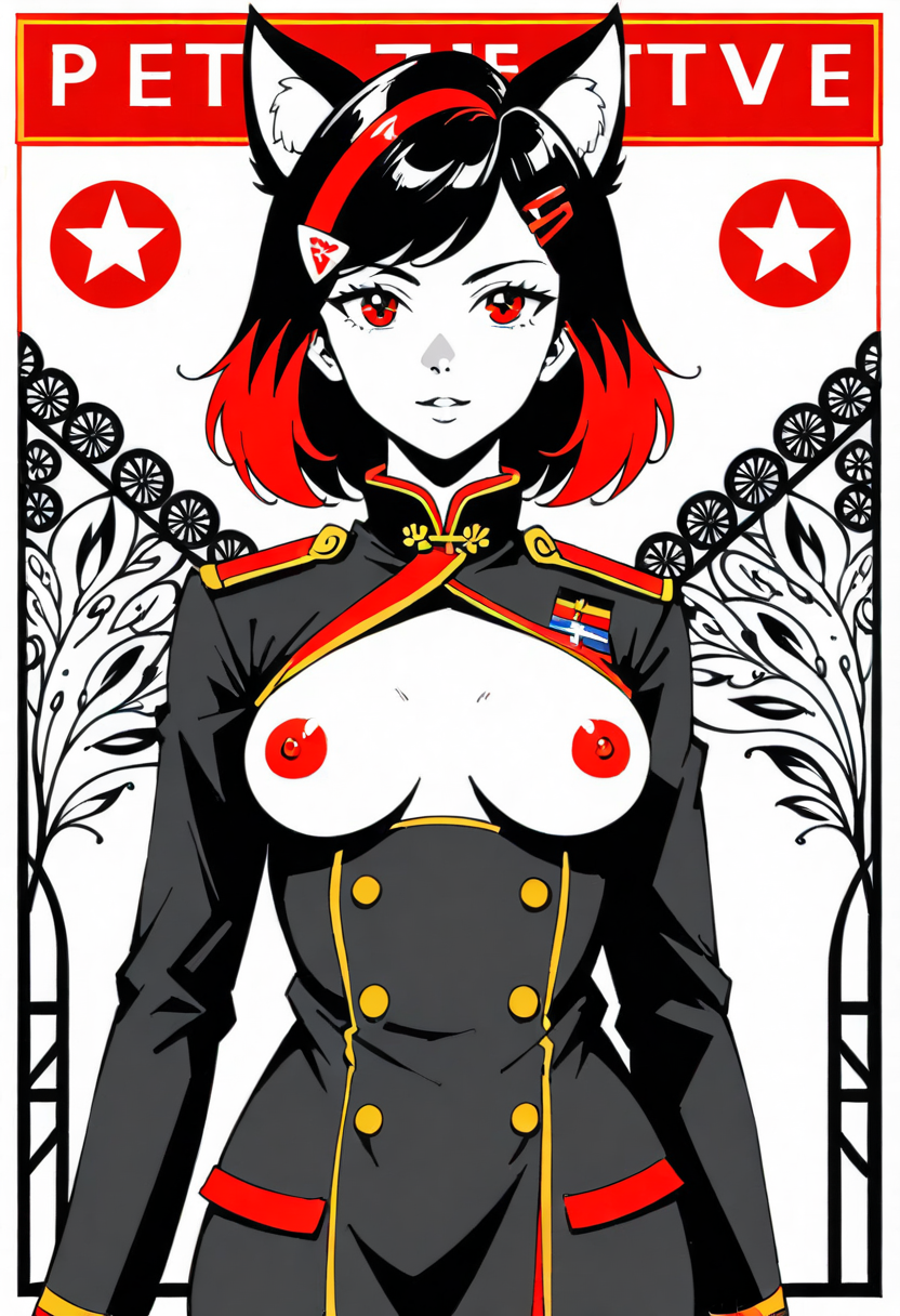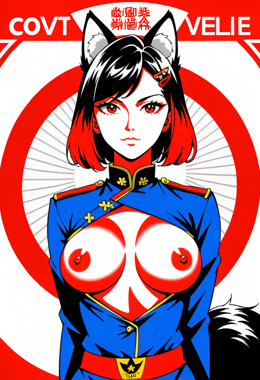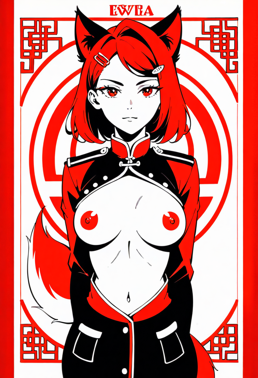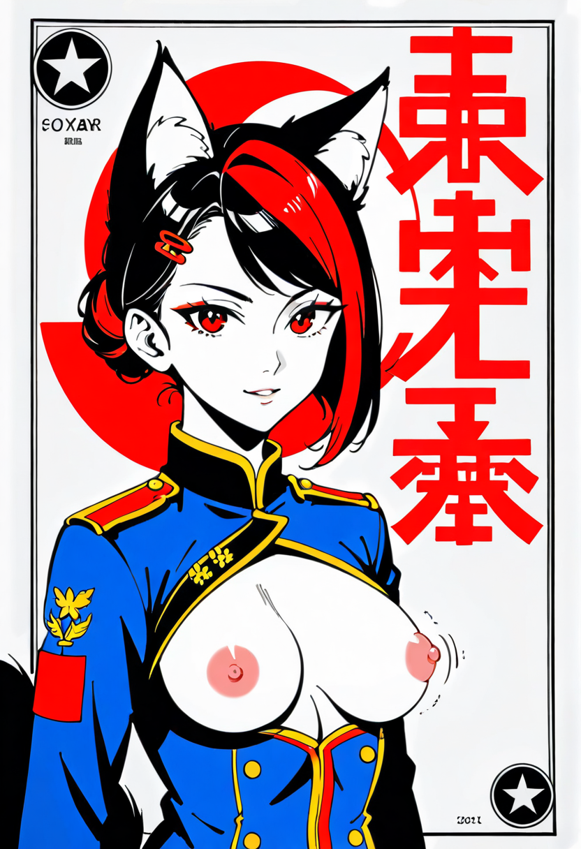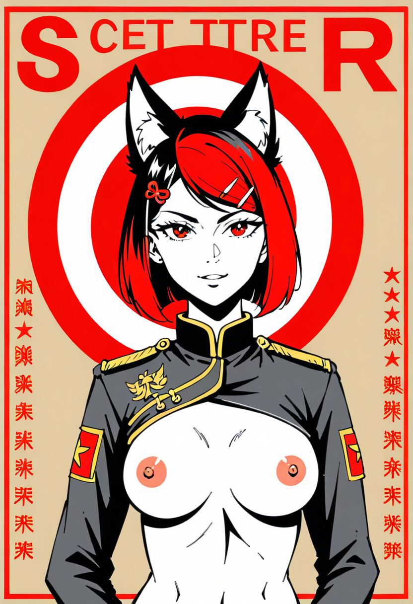 Firefox-Skollie, red eyes, china fox girl, fox tail, multiple tail, multicolored hair, 1girl, hairclip, hair covers ears, solo, medium breasts, looking at viewer, nsfw, cccpposter, sovietposter, soviet poster, China, China poster, soviet, red monochrome, propaganda poster, military uniform