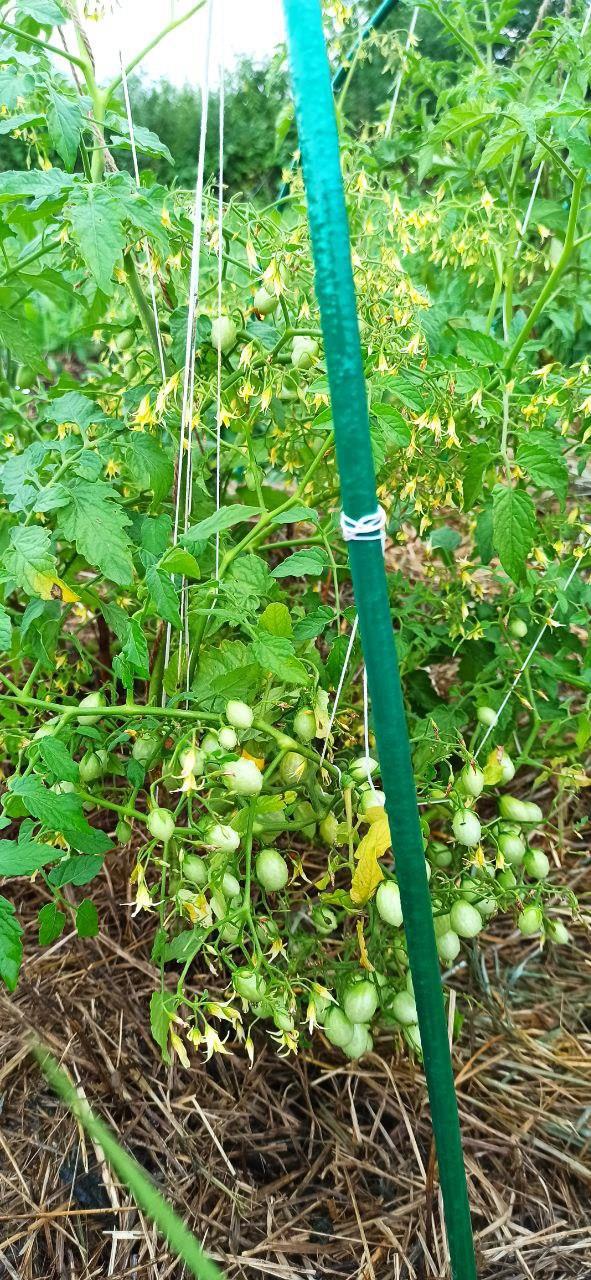 Ну и напоследок — "огромные" томаты, каждый аж по 5 граммов весом! Для того чтобы было понятнее, это размером с крыжовник. Жуть как мелко, зато жуть как много. Детям будет веселье. Вроде томатик, а вроде ягодка красная (пока зеленая).