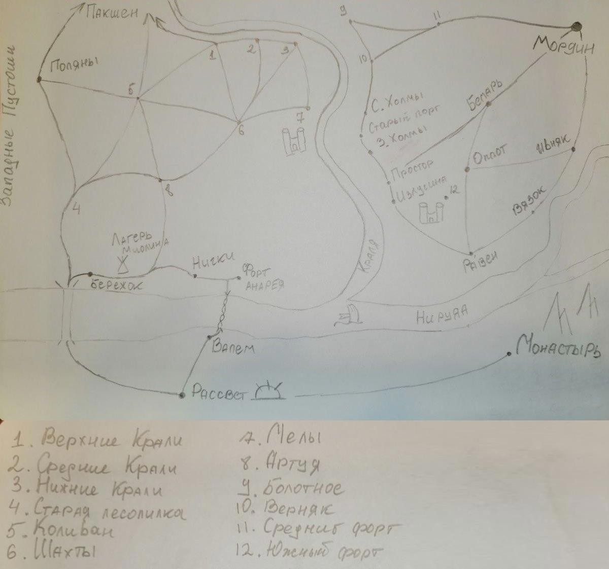 5) Касательно масштаба. Речка преувеличена в размерах + масштаб соблюден не везде. Переход между Рассветом и Валемом всаднику - не более часа. Между Полянами и Рассветом - около восьми часов. Остальные расстояния плюс-минус аналогичны. То есть, вылазка Анарея за Кралю, будь он командиром конных, перевела бы под крыло Пакшена Мординские деревни меньше, чем за сутки.
