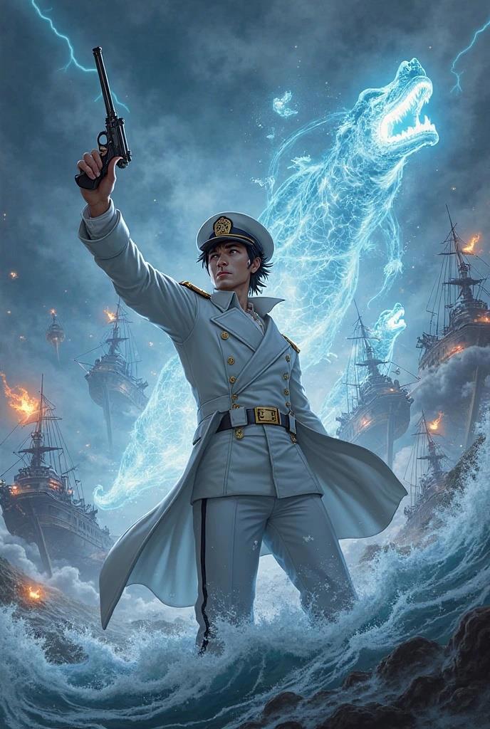 Вокруг него материализуются призрачные силуэты как его исторических торговых судов компании Камеяма, так и кораблей Императорского флота эпохи Русско-японской войны, каждый увенчан пламенной головой дракона. Флотилия существует одновременно в прошлом и будущем - от деревянных пароходов Бакумацу до броненосцев Цусимы, объединенных волей "смиренного слуги из Тоса".