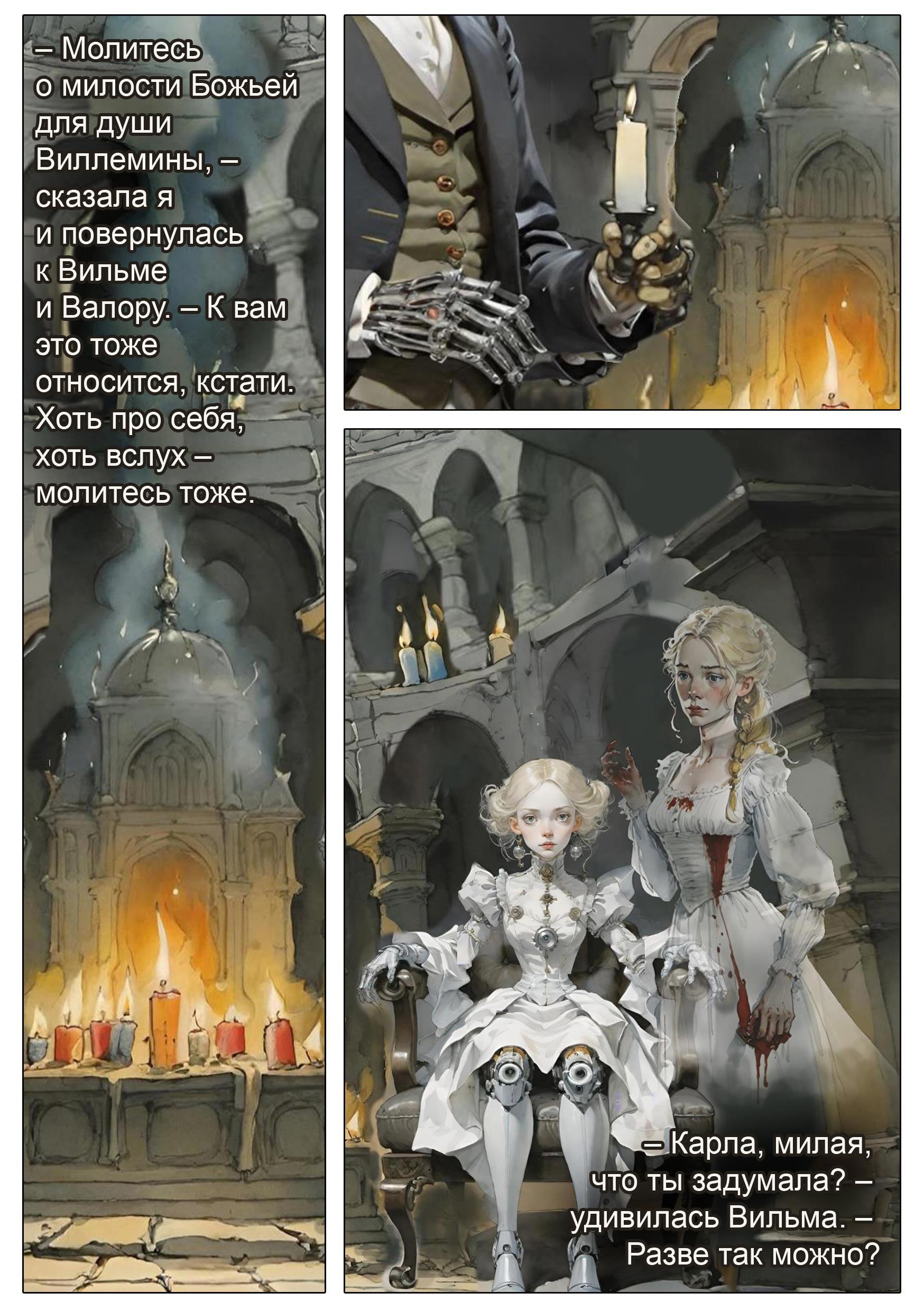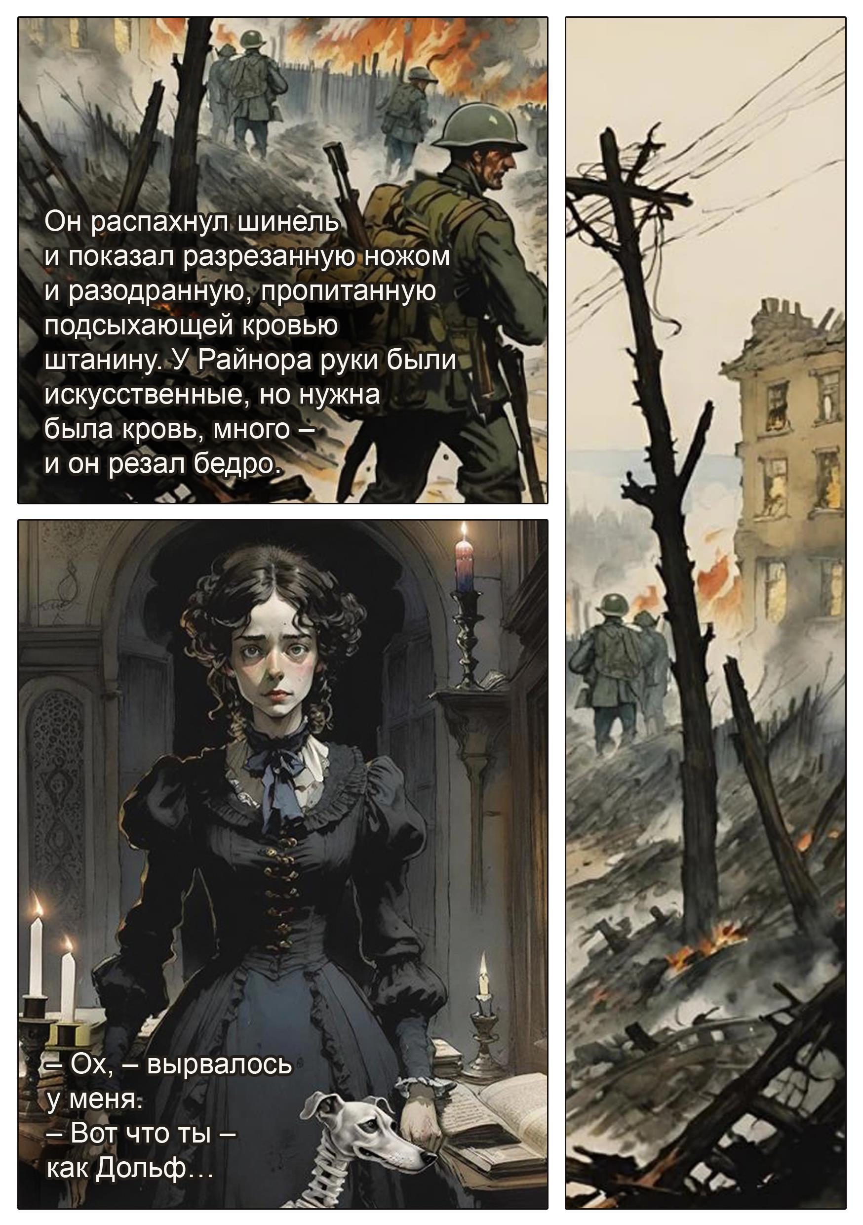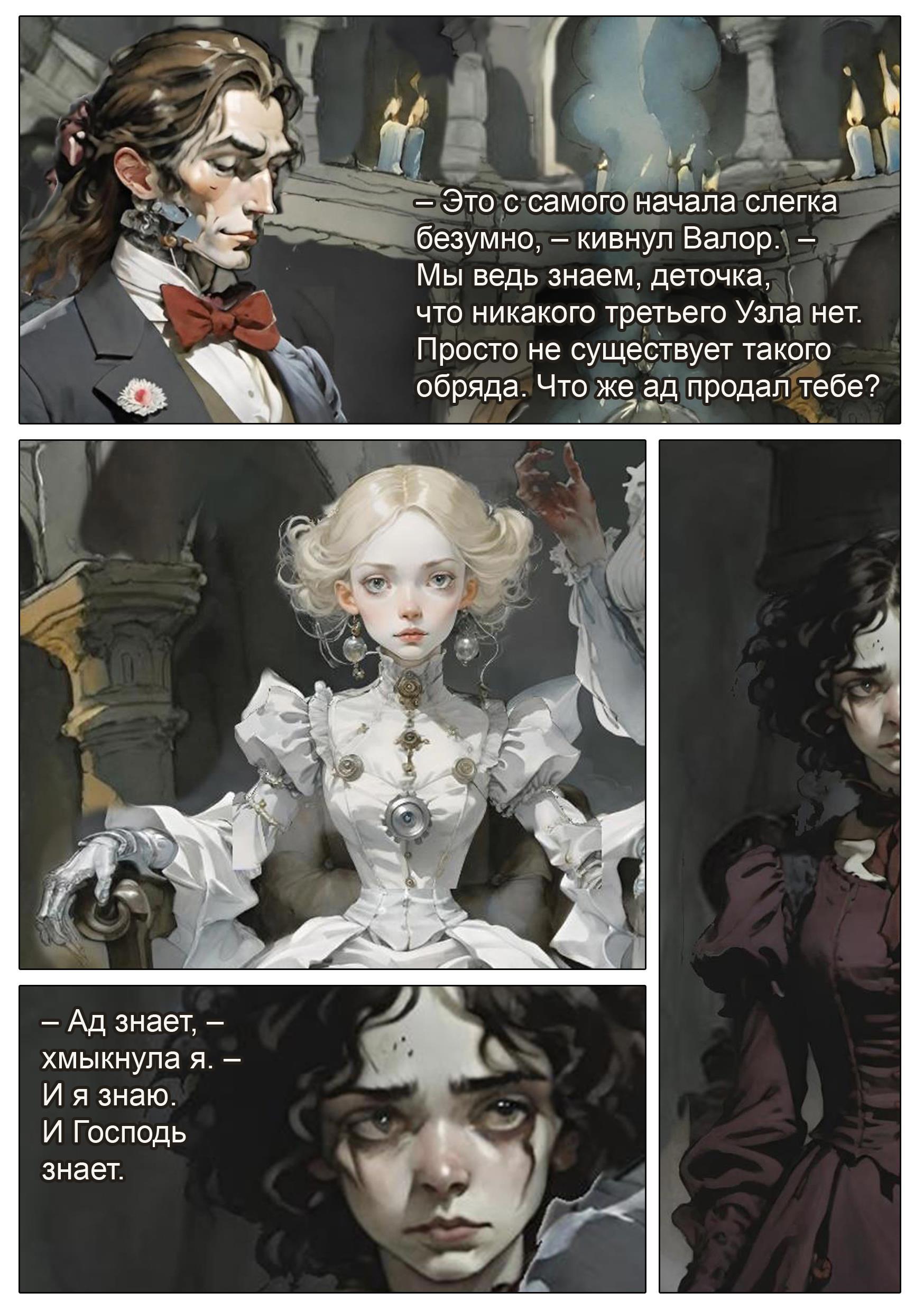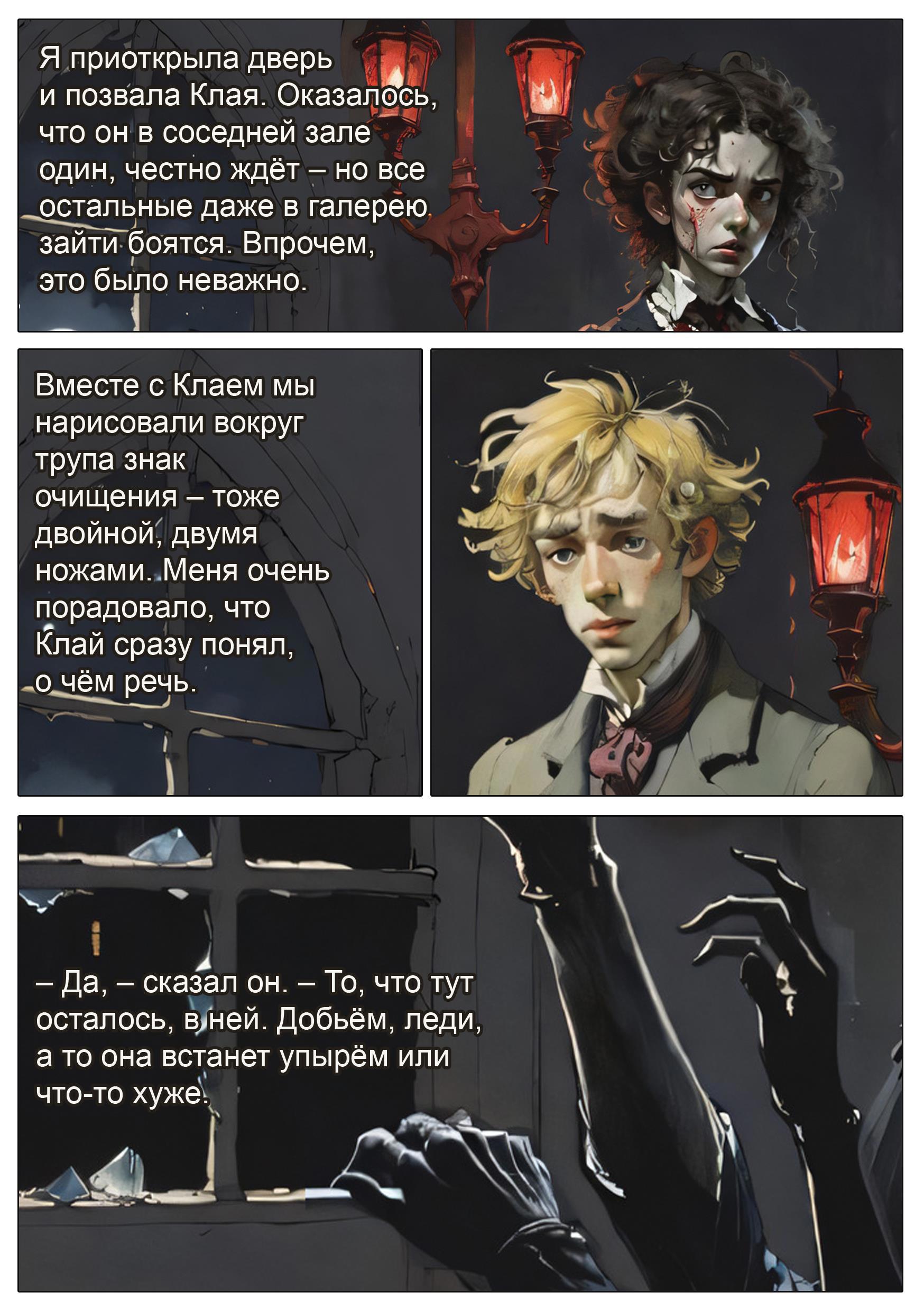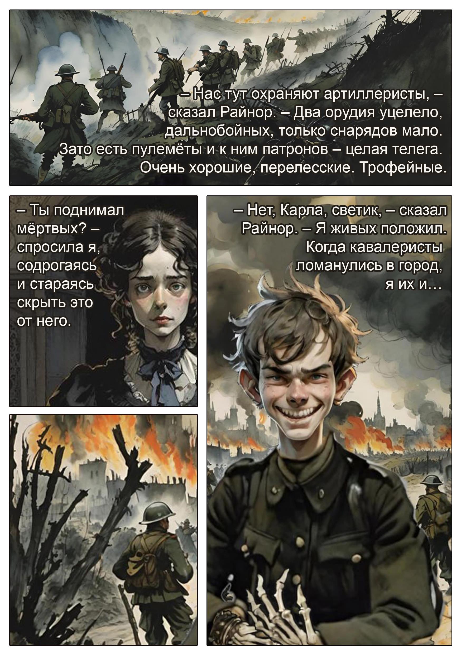 Единственный недостаток этих комиксов - они очень трудоёмкие. На создание эскизов, на обработку эскизов времени, плюс кропотливая вёрстка - времени уходит, как на картинку, рисованную руками. Ну, в конечном счёте она и сделана руками, нейросеть участвует, скорее, как вспомогательное средство.