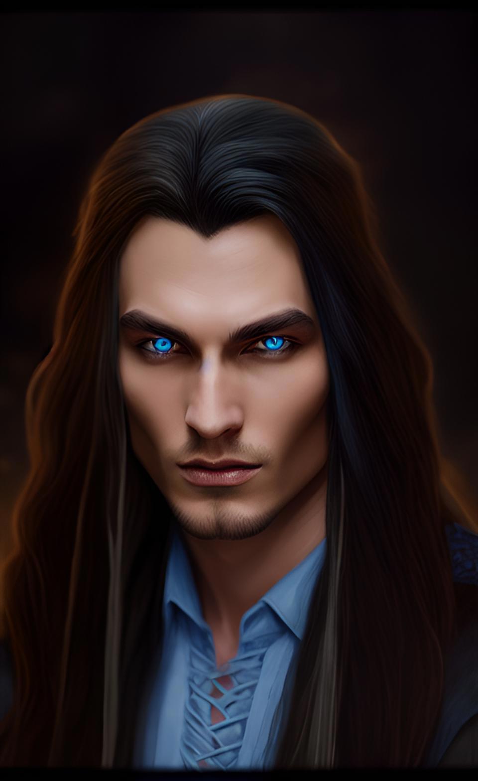 По внешности: острые скулы, мерцающие синие глаза, иссиня-черные волосы до лопаток. Всегда выбрит до синевы.
