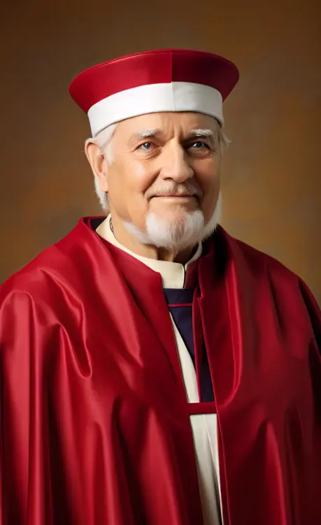По внешности: невысокий, но крепкий старик с небольшой бородкой, носит алую мантию и округлую шапочку.