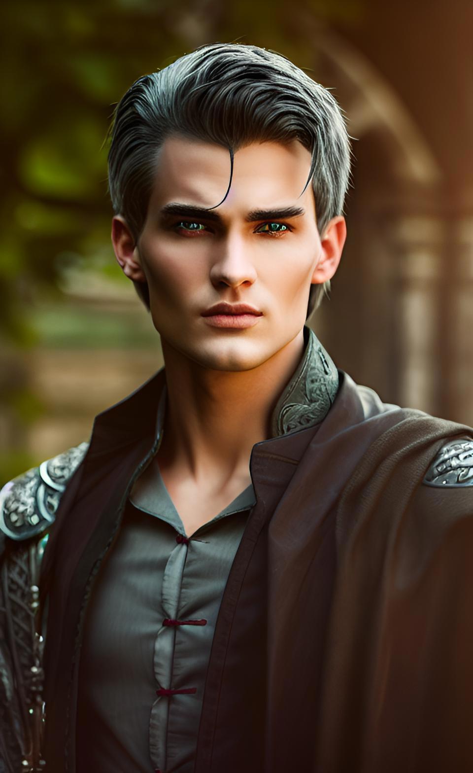 По внешности: высокий, стройный, изящный, пепельные волосы и светло-зеленые глаза. Мягкие, располагающие черты лица. Красавец.