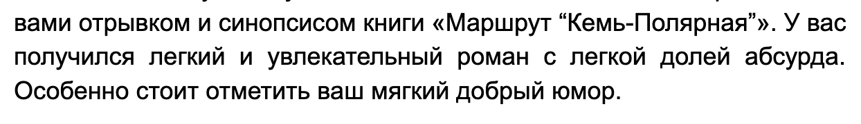 Хотя письмо с обоснованием мне понравилось, тон весьма доброжелательный. Погорела я на слишком сжатом синопсисе (им не хватило мотивации и объяснений, которые в тексте-то есть, но из синопсиса я выкинула, чтобы не раздувать объём), плюс слишком широко указала ЦА. Ну и доп вычитка отрывка не помешала бы (потому что нечего отправлять в последний день что есть, хотя я думала, что отрывок для общего впечатления, а оказалось — нужен вылизанный текст, чтобы хоть завтра в печать).