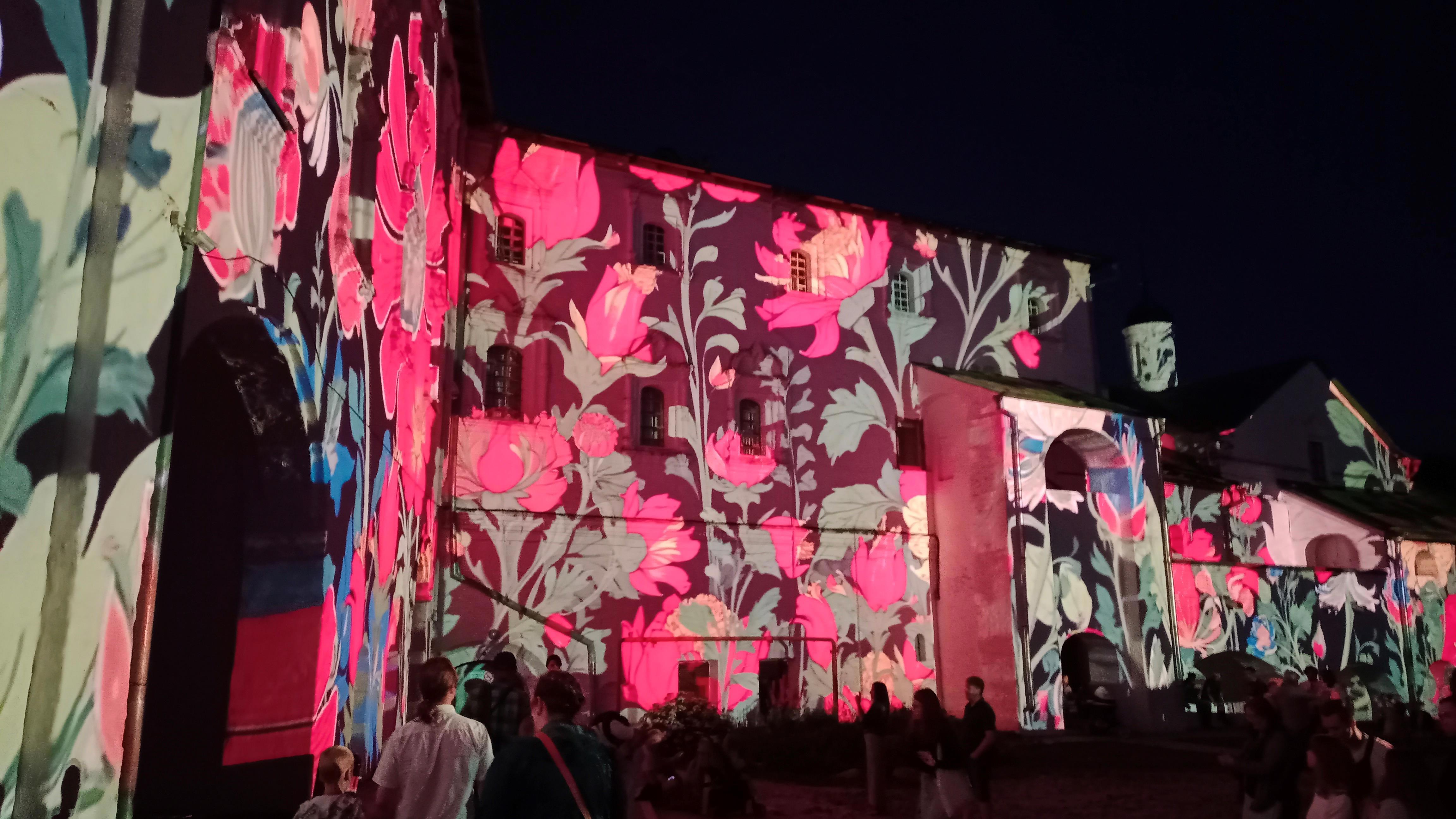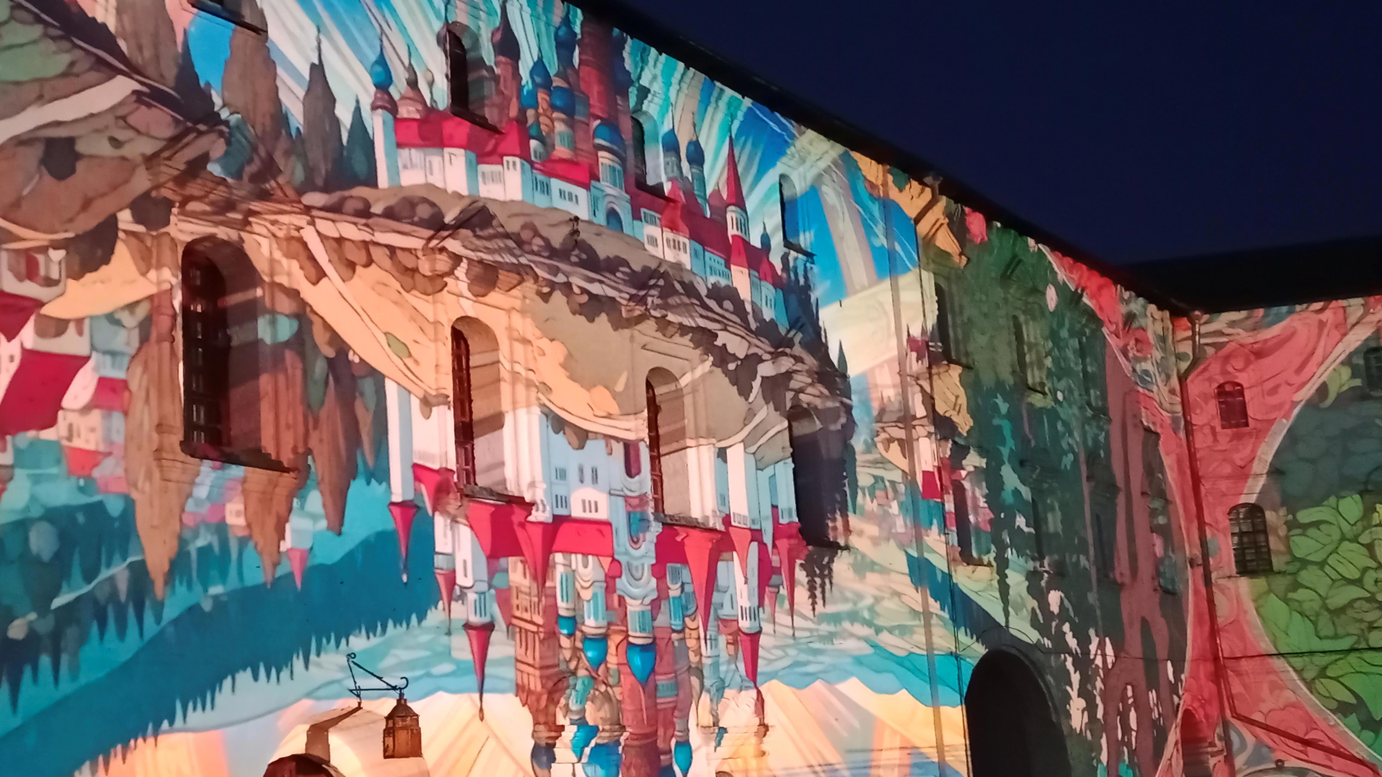 Концерт сопровождался впечатляющим лазер-шоу, проекциями цветных узоров и картин на стены бывшего архиерейского дома, возле которого концерт состоялся.