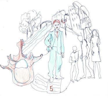 Это философская притча, замаскированная под лёгкий ужастик о том, чем мы можем заплатить за исполнение желаний при помощи волшебства (т.е. без собственного труда). Волшебной вещью была непонятно чья косточка, уколовшись об которую ты исполнял желание. Но ГГ это привело к тому, что люди для него стали безликими монстрами. Поэтому здесь я выбрала рисунок в технике, которую поазала Ирина Лакота, когда рисуешь сразу начисто линером одной линией, глядя в основном не на бумагу, а на то, что рисуешь. Единственно, что добавила немного цвета для ключевых элементов иллюстрации.