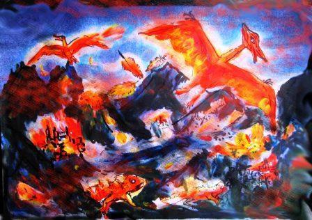 Это фэнтези для подростков. Главная героиня девочка - хулиганка и жестокая, как многие подростки, к своей более мягкой, домашней ровеснице. История тоже жёсткая, без счастливого конца, но с моралью. Я вначале хотела нарисовать одну из этих противостоящих друг другу девочек, но в рассказе есть очень сильный и поэтичный образ, важный для всей этой истории. Там есть вулкан, из которого, когда он просыпается, вылетают огненные страшные птицы, похожие на птеродактилей. Когда они летят, то роняют огненные перья, от которых всё загорается. А по земле бегут огненные ящерицы, тоже разнося пожары. Именно это мне и захотелось нарисовать. Здесь я попробовала использовать акрил вместе с акварелью, и даже местами рисовать пальцами, как опять таки показала Ирина Лакото. Такой способ помогает лучше передать чувства, которые испытываешь в момент рисования (хотя и в ущерб рисунку). Вот что у меня получилось.