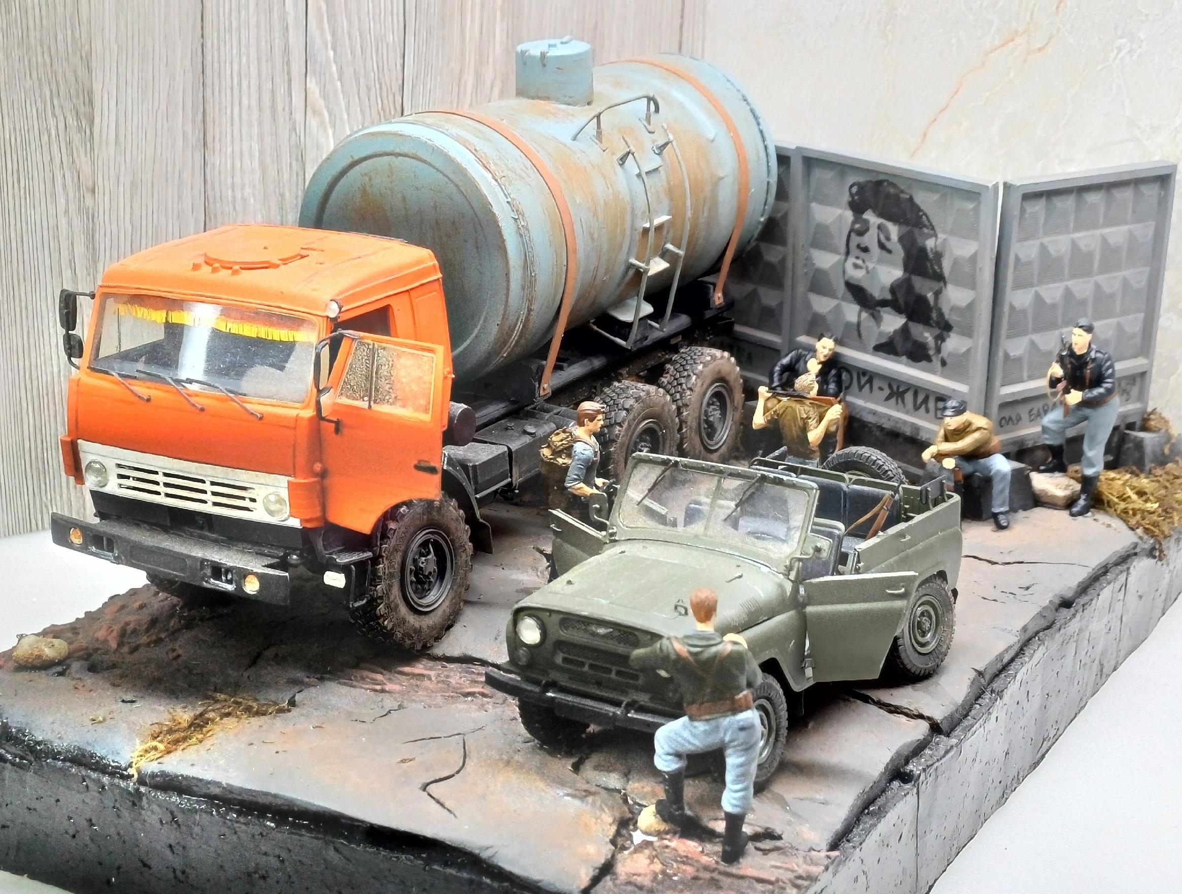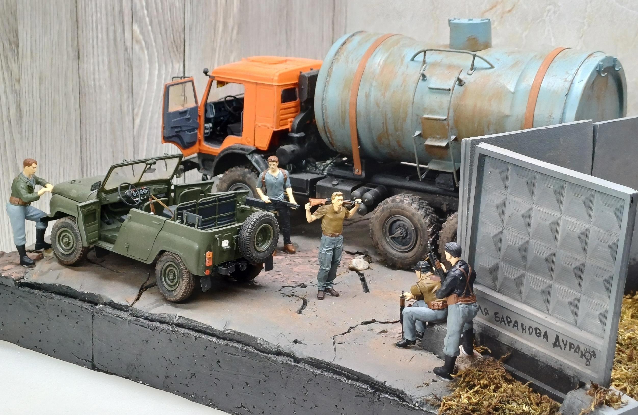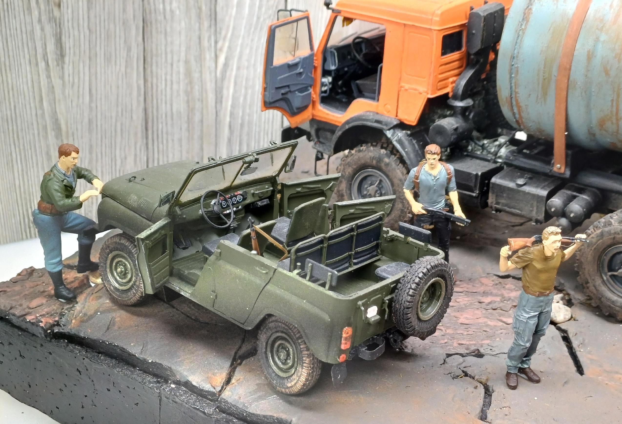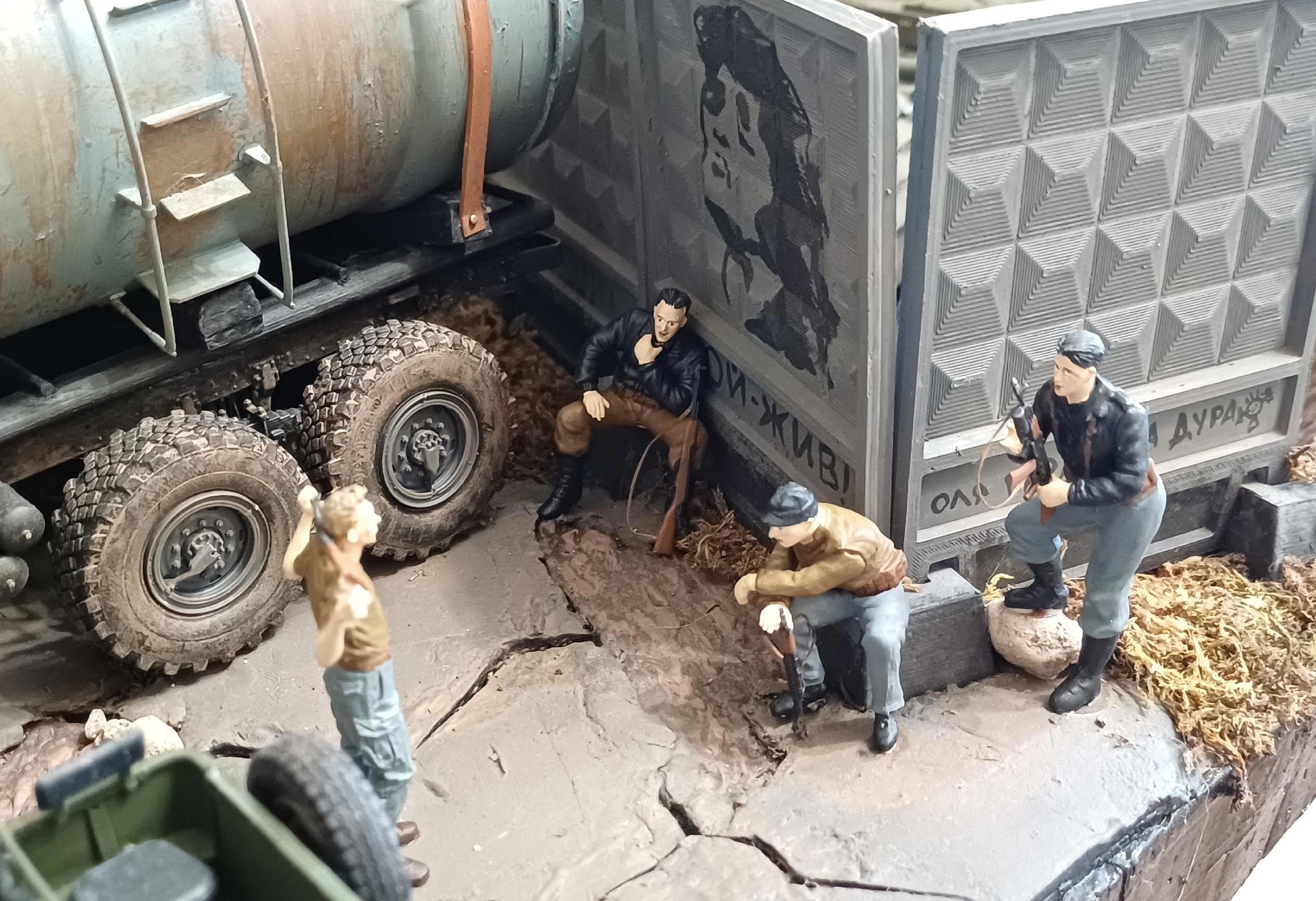 В принципе, получилось не хуже, чем я представлял. Все фигурки встали на диораму почти как родные. И понял, что мне категорически не хватает старого советского оружия для диорам - СКСы нашел, "ксюхи" нашёл, а вот с обычными калашами пока что засада. Надо купить при случае.