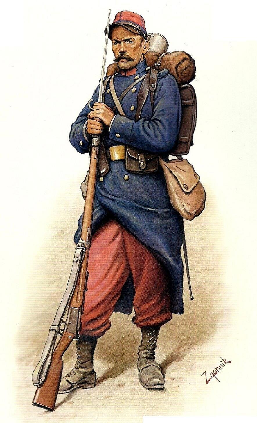 С началом военных действий французская пехота начала нести огромные потери от германских снайперов. Дело в том, что французские солдаты давно уже щеголяли в ярко-красных штанах являвшихся традиционной формой республики. Красный на любой местности и в любое время дня заметен, а значит несёт своим хозяивам только смерть. Германские стрелки без особого напряга перестреляли почти весь личный состав французских передовых отрядов и только после этого офицеры обратились к командирам с просьбой изменить форменную одежду.