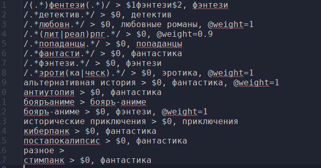 Тут и исправление фентези на фэнтези, и удаление мусора вроде "разное" и нормализация тегов: "фантастический детектив" дополняется тегами "фантастика" и "детектив".