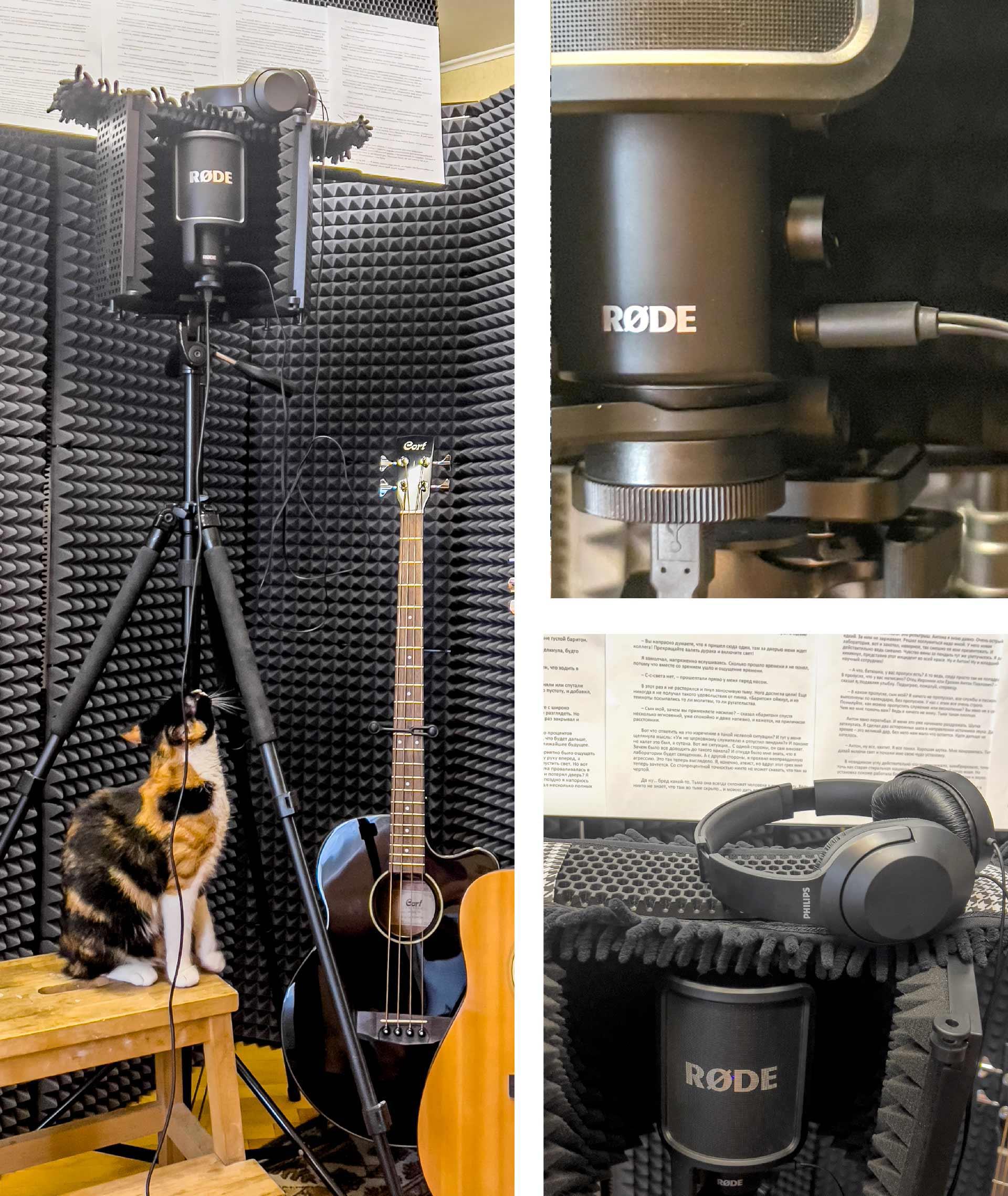 После кучи видео с советами, я понял что хочу RODE, аж зубы сводит – известная фирма выпустила микрофон для любителей и дилетантов. Прям то, что нужно мне. Со встроенной звуковой картой и подключением по USB, со своим поп-фильтром, который уменьшает всякие призвуки организма – шумное дыхание, и всякие щелчки, и причмокивания. Микрофон – конденсаторный с кардиодной диаграммой направленности, т.е. звук он собирает в основном пред собой, что и нужно чтецу. А еще у него есть вход для подключения наушников, в которых слышно все, как будет на записи. Это дает моментальную обратную связь, и очень быстро можно, слушая себя, подбирать нужные интонации и громкость голоса.