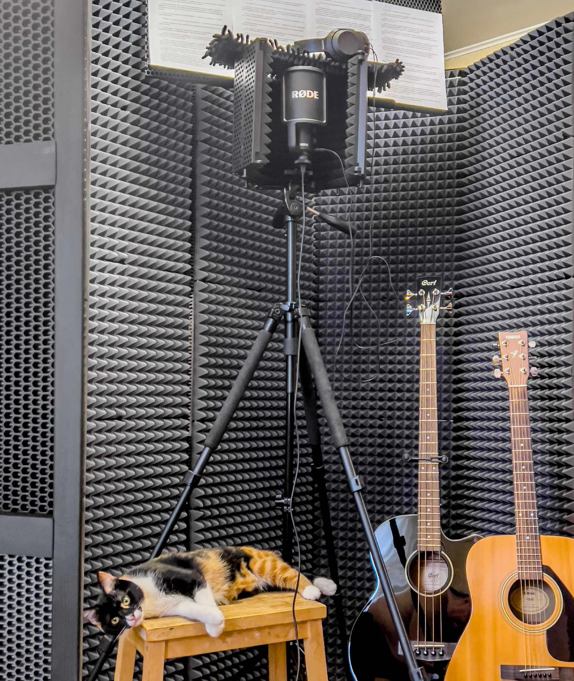Честно сказать, я долго отодвигал встречу со своим голосом. Это как войти в холодную воду, можно прыгнуть и нырнуть сразу с головой, или же входить постепенно. Микрофон лежал в коробке, пока я ему не приобрёл звуковой экран из поролона, чтобы убрать эхо сзади (так легко быть умным и предусмотрительным, когда есть интернет). Затем я узнал, что есть такое замечательное слово в русском языке, наряду с пипидастром, – пюпитр! Долго с сыном мы изгалялись типа: "Каждый интеллигентный человек должен отличать пюпитр от пипидарста". Пюпитр позволил читать стоя – очень удобно и правильно. Стоя легкие расправлены и можно жестикулировать, входя в роль. Потом он ждал, пока я подберу ему стойку, он получил фотоштатив из моего прошлого – когда я работал на себя, свадебным фотографом и видеографом. Потом он томился в коробке пока я не сколотил из дерева ширму для снижения эха за спиной чтеца. Ширму я делал долго, по выходным, больше месяца.