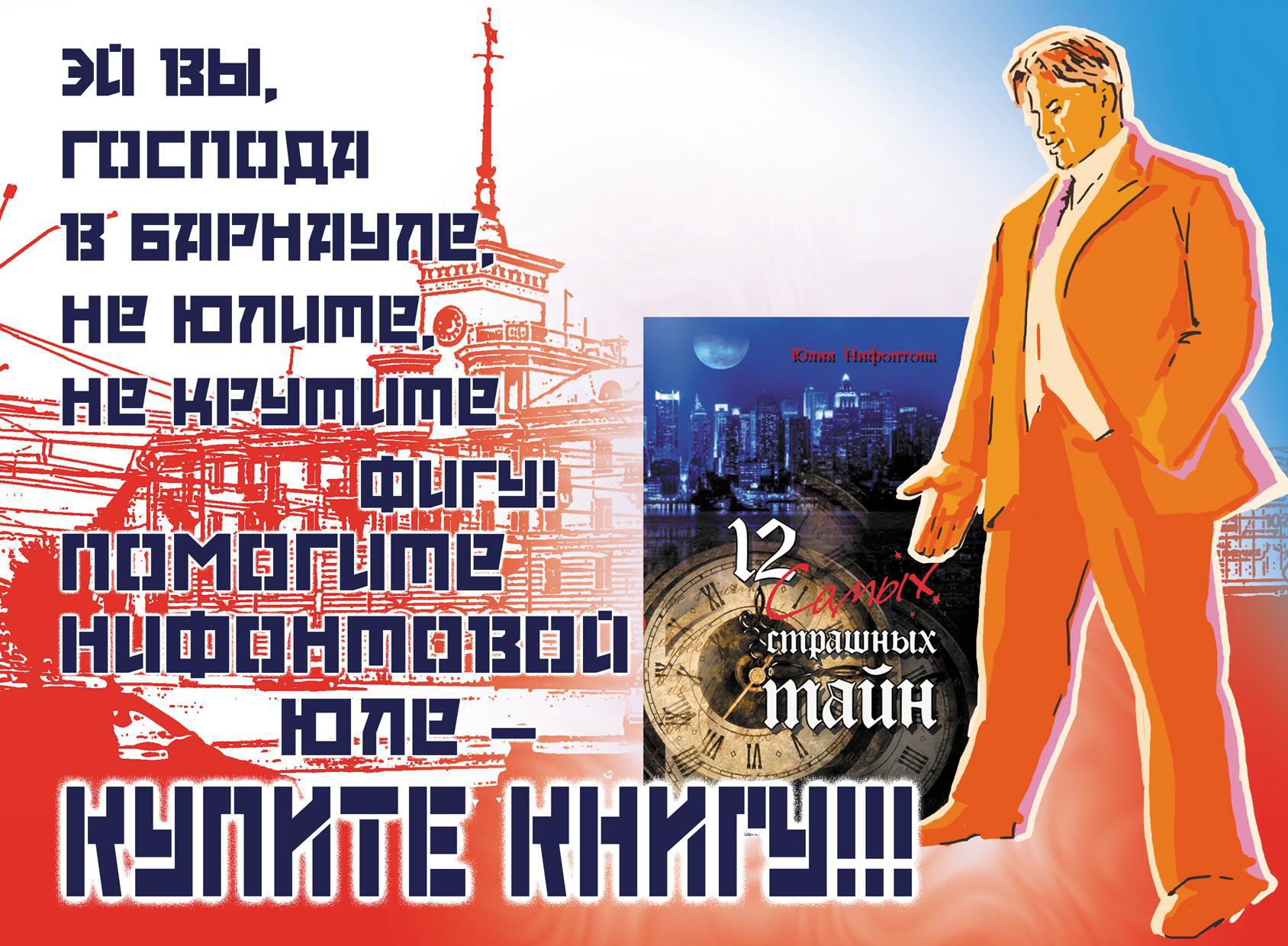 Дорогие мои друзья, уважаемые коллеги, любимые читатели и все жители города Бийска (Алтайский край) с радостью сообщаю вас, что всех с нетерпением жду 27 июля в 13:45 на своей творческой встрече «Двенадцать самых страшных тайн Юлии Нифонтовой», которая состоится в рамках Большого книжного фестиваля-ярмарки «Петровский бульвар» (адрес: г. Бийск. Петровский бульвар. Лекторий № 1)!