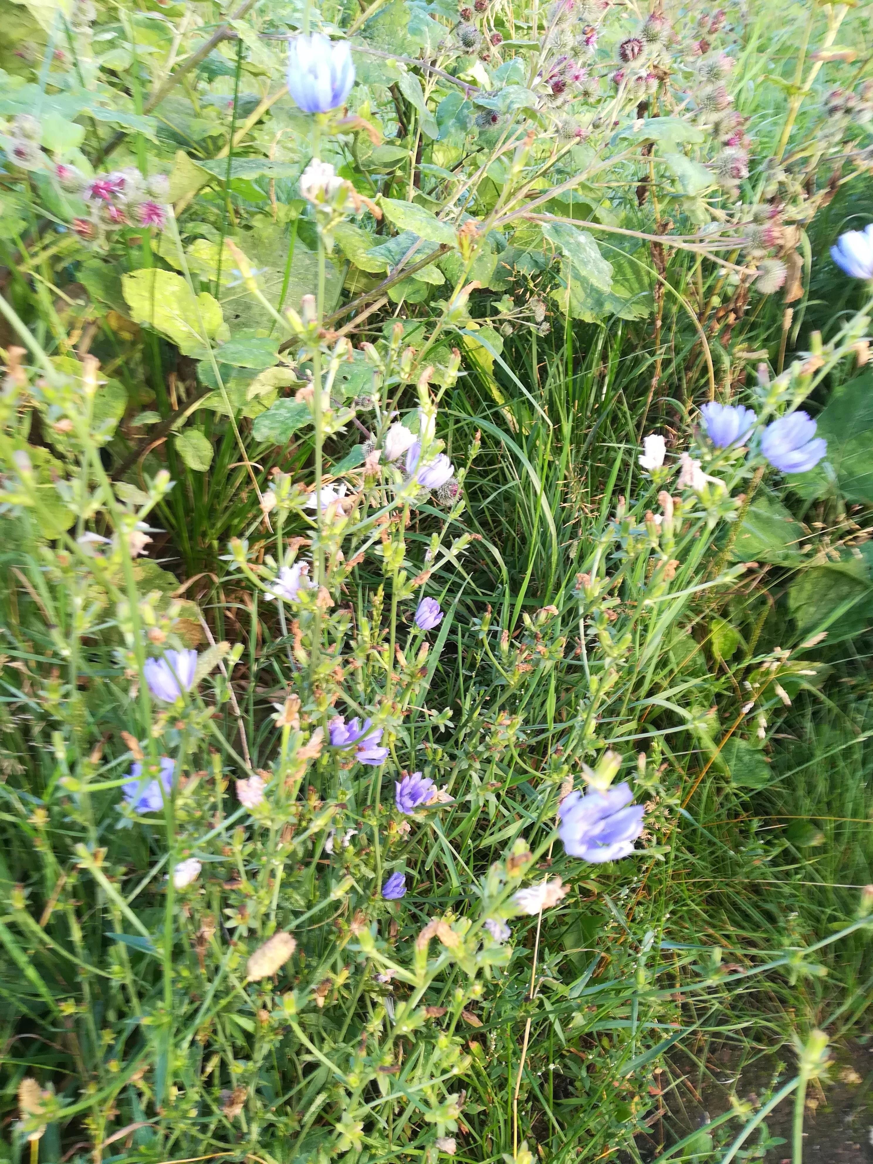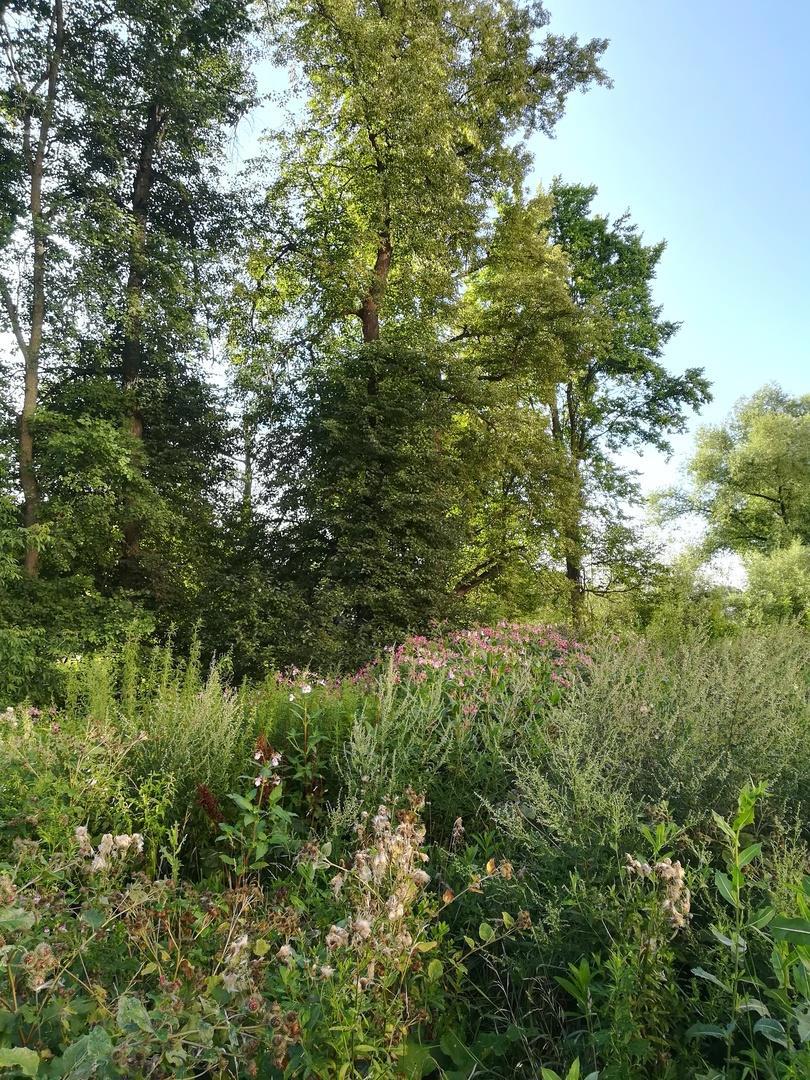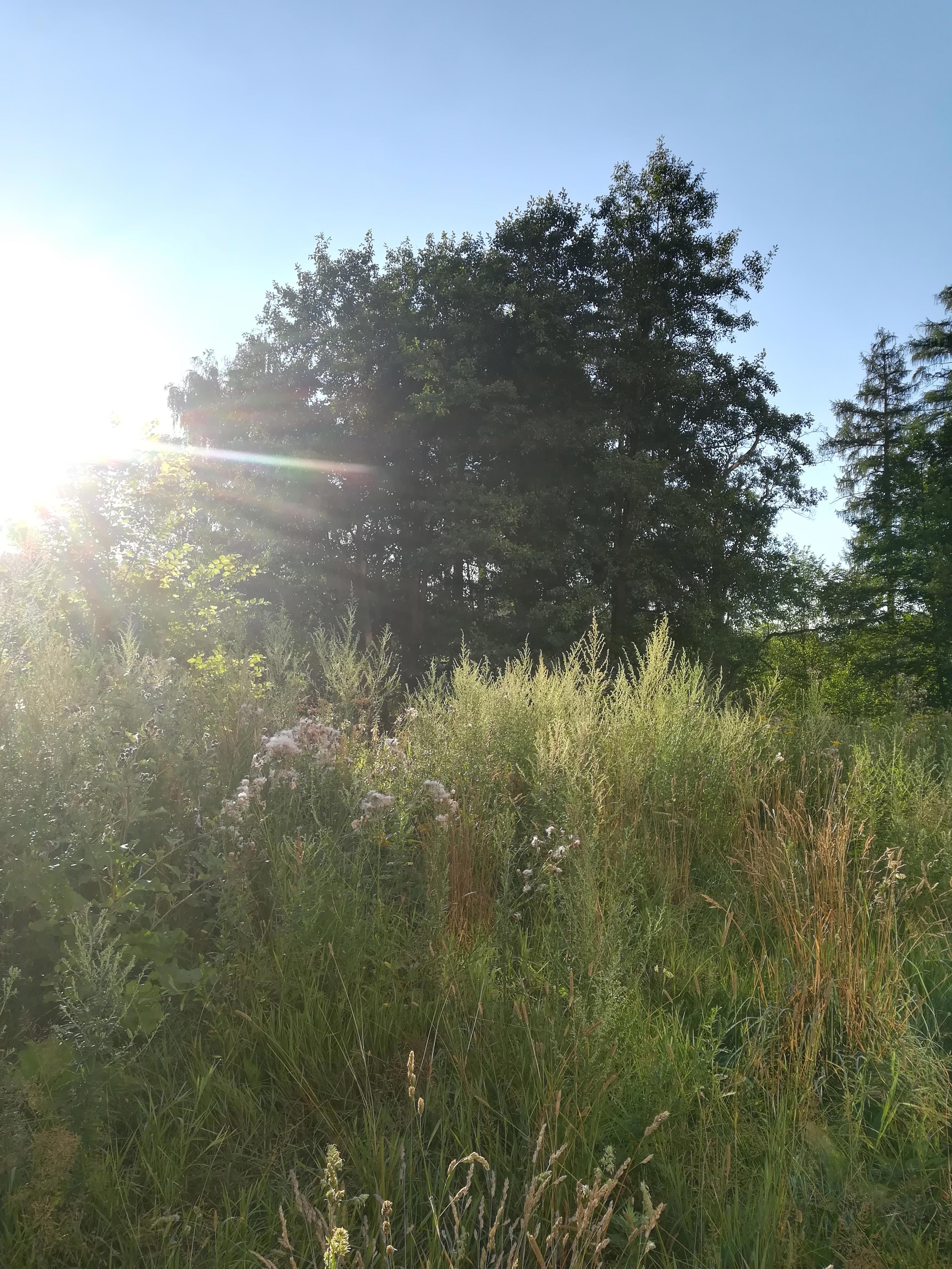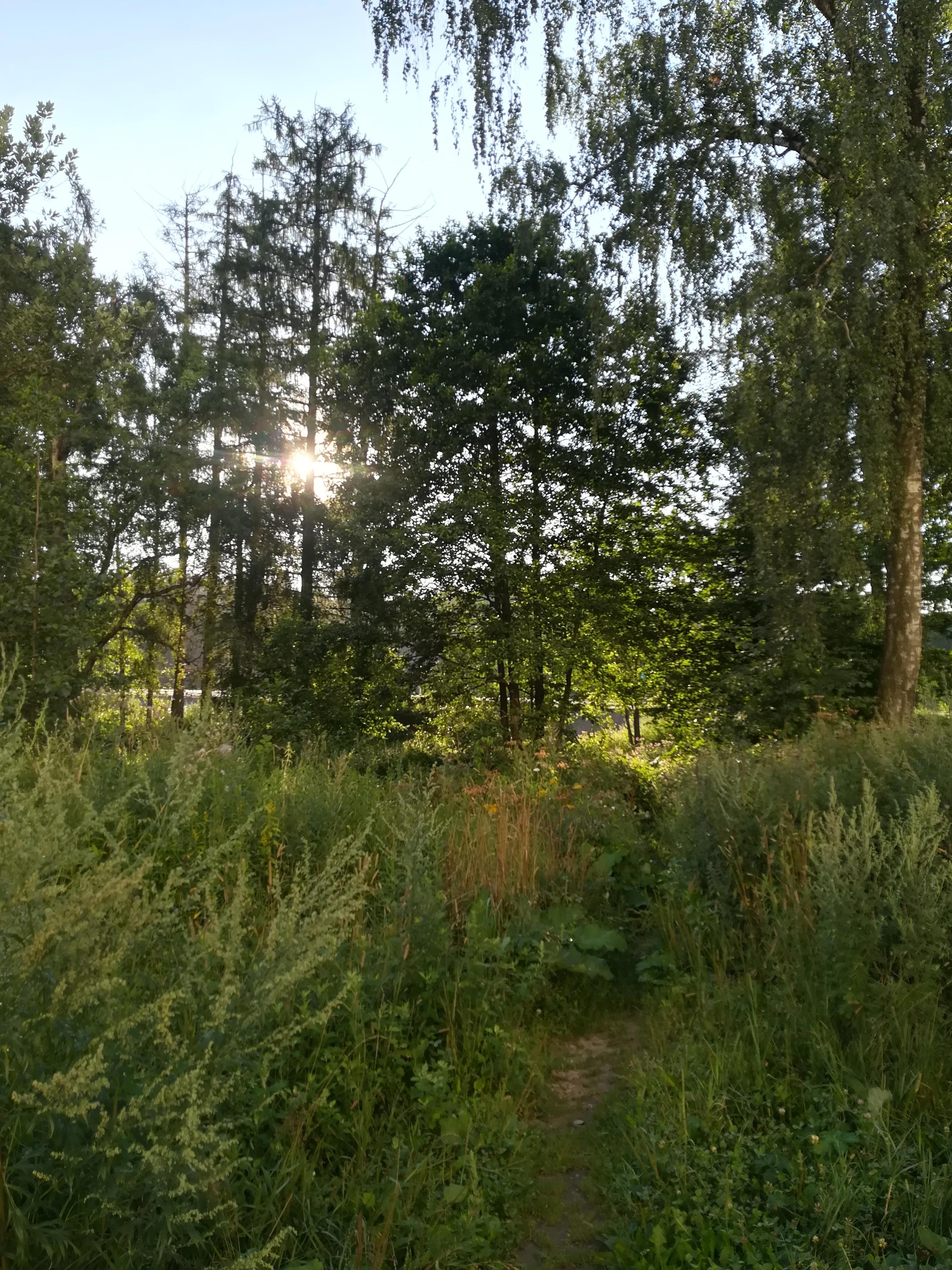 Наш лесочек вырубили, теперь там будет трасса, но немного деревьев осталось. Я прошла по краю, подышала разнотравьем и получила порцию витамина Д. И еще промочила ноги в росе))