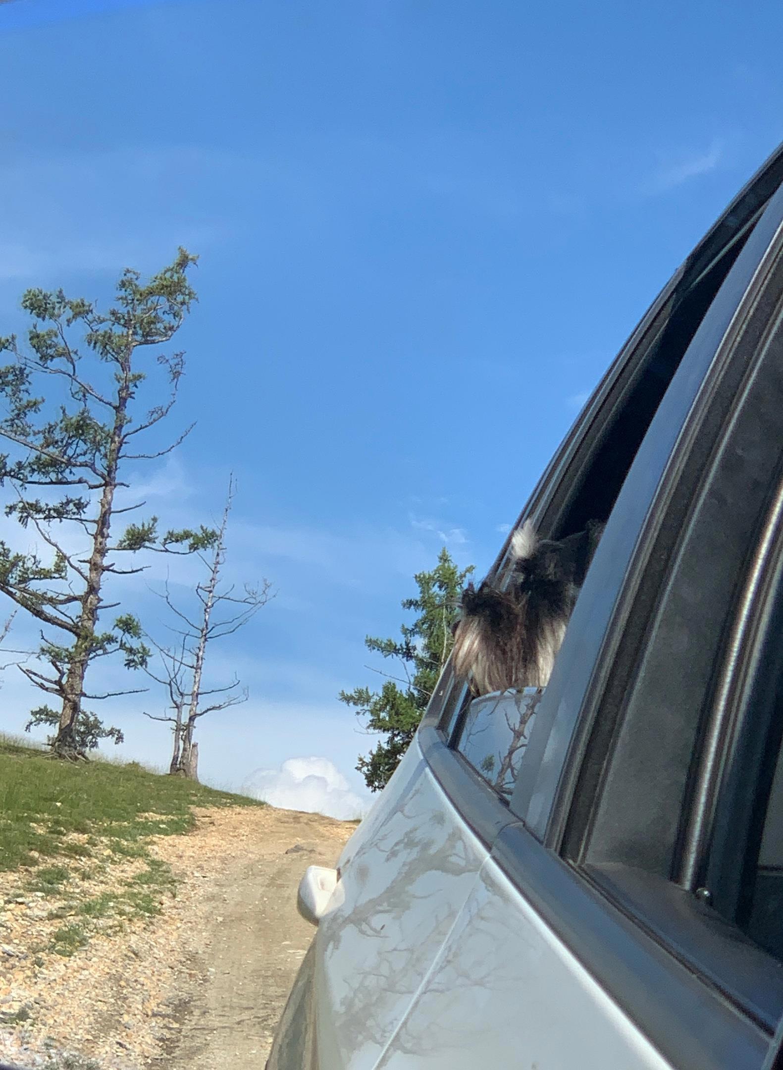 Хуф из Бугульдейки уезжать не хотел. Сидел, грустно смотрел в сторону поселка, пока он не скрылся за очередным пригорком. Еще бы, там песчаный пляж, собаки и коровы. Всё, как ему нравится :))