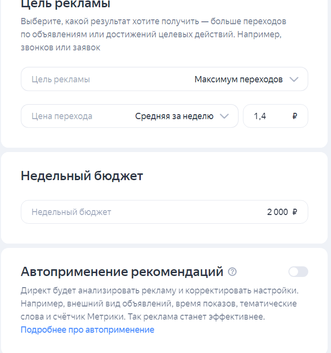 Ниже указываете стоимость, в которую вам обойдется один клик по рекламе. Обычно это идет цена от 1 до 2 рублей за клик, но иногда эту стоимость придется варьировать.