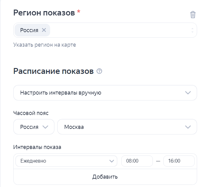 Дальше осталась тонкая настройка региона показов, времени и т.д.