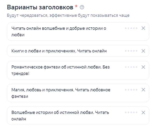 Как работает отображение объявления: берется рандомный заголовок и рандомный текст с картинкой - на основании этого формируется объявление. При этом будет формироваться статистика, мол вот на этот заголовок кликают чаще, а в от на этот - нет. НУ и вы, соответственно, можете вносить изменения или оставлять все как есть, но, согласно справке Яндекса, такие элементы вроде как могут отображаться реже тогда (но это не точно). После создания рекламы я эти настройки покрутила буквально один раз, а потом забила болт...