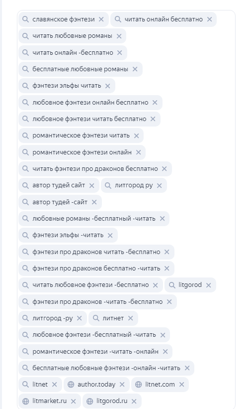 Интересы и поисковые запросы. Это уже, собственно, набор тех ключевых запросов, при поиске которых люди и будут видеть вашу рекламу. Опять же можно поставить автомат, но лучше прописать вручную все возможные варианты. Представьте себя на месте читателя, который ищет себе в поисковике книжку на почитать.