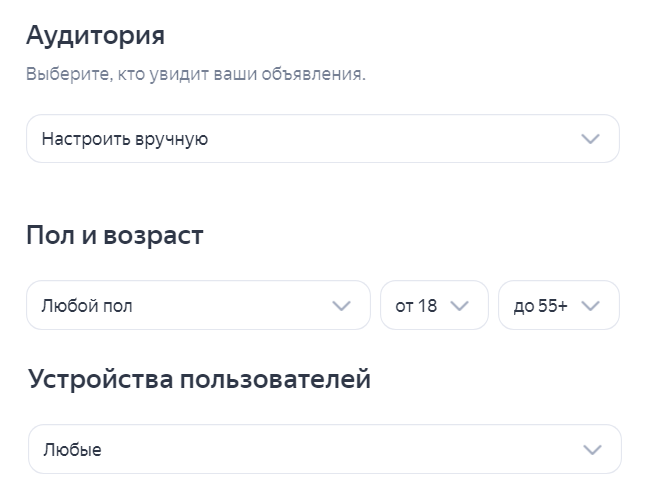 Аудитория... Можно оставить автомат, но я на всякий пожарный выставила вручную. Также можно ограничить, на каких устройствах будет видно рекламу (стацпк, планшеты, смартфоны и т.д.) Как показывает практика, больше всего реклама крутится как раз на мобильных устройствах, ибо там блочнуть рекламу гораздо сложнее. Ну вы поняли...