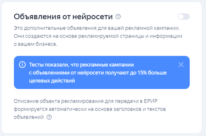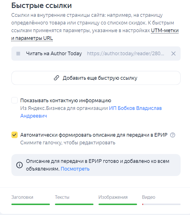 Здесь же надо не забыть галочку "Автоматически формировать описание для передачи в ЕРИР". Тот самый ЕРИР, в котором собираются данные для соблюдения закона о рекламе. Если вы эту галочку не поставите, то для соблюдения закона данные придется передать самому. Я в душе хз, как это делается, поэтому доверила это дело Яндексу...