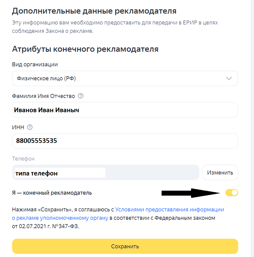 Нас интересует графа "Данные рекламодателя". Согласно закону о рекламе рекламодатель должен указывать данные для отправки в единый рекламный реестр (более детально не помню, можете погуглить если хотите, короче так надо, вот...)