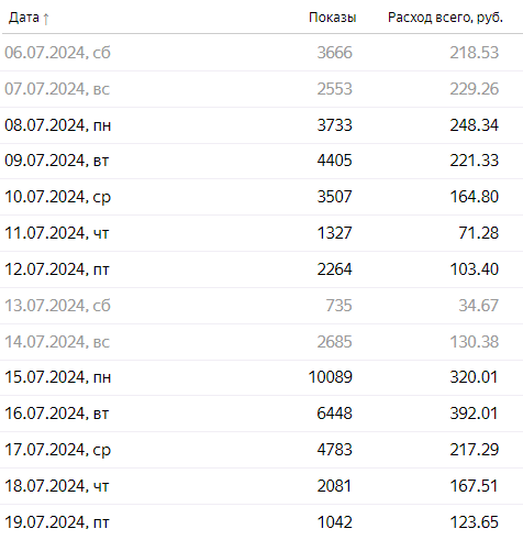 В этой таблице вы также можете увидеть значительные просадки с 11 числа. Это как раз были дни, когда кто-то ворвался в рекламу с крупным бюджетом и высокой ценой клика.