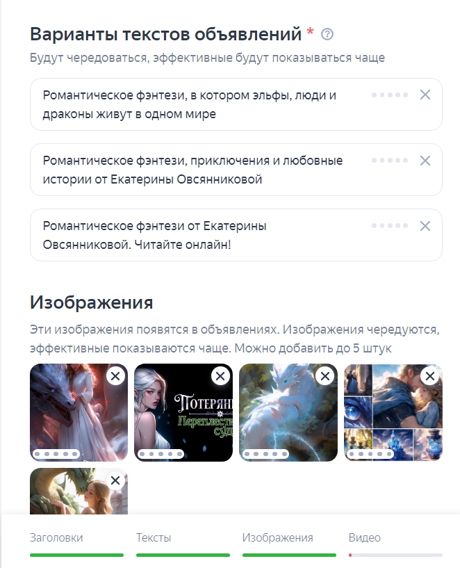Видео я добавлять не стала, хотя, как я поняла, можно и это сделать, якобы для лучшей эффективности кампании.