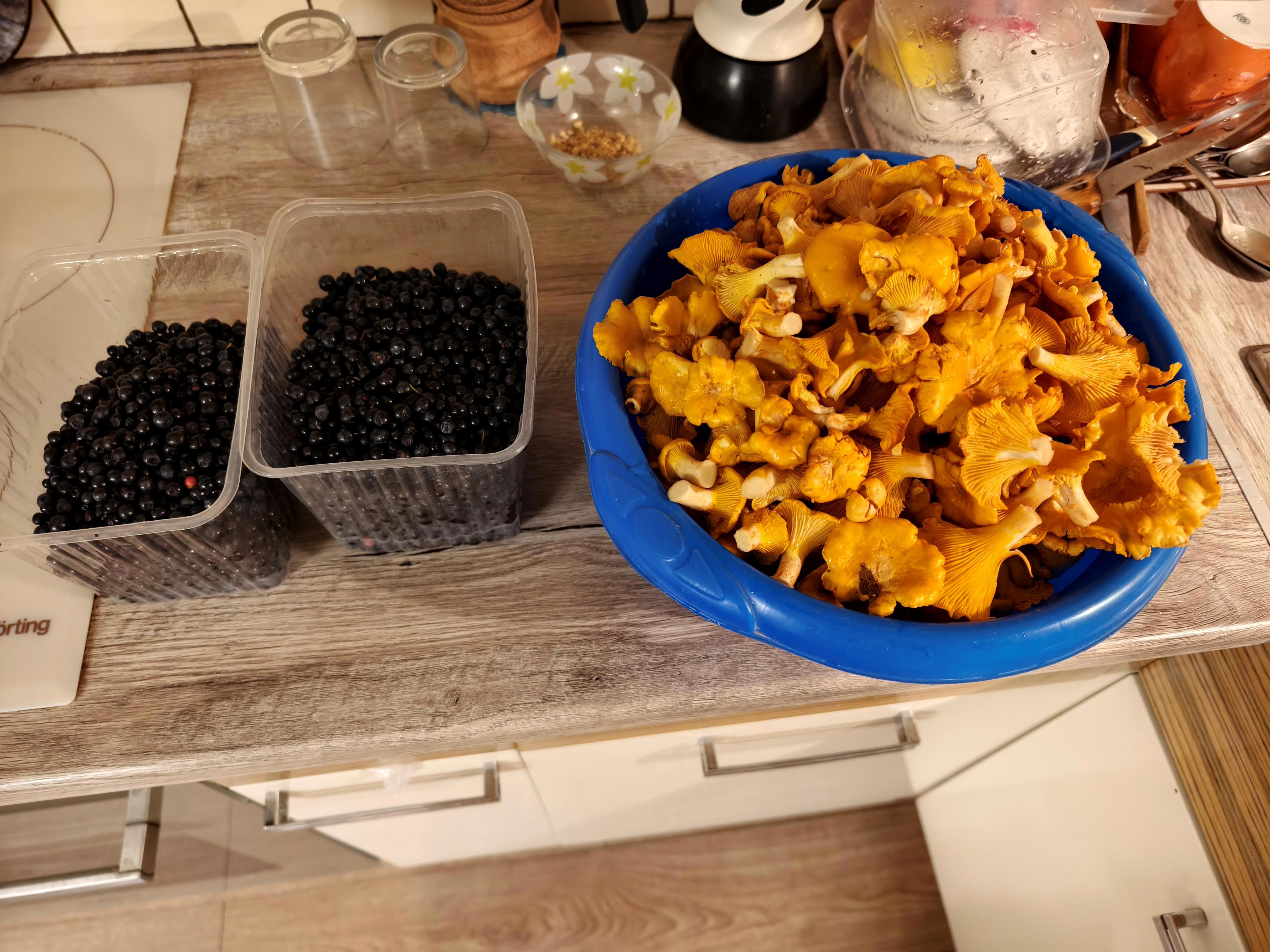 Этот день мы посвятили сбору ягод и грибов. К сожалению, наше место сбора рассекретили и теперь там ягоды нет. Кто-то её просто уже собрал. Пришлось искать ягоду рядом в округе, но всё равно её было очень мало. Зато лисичек было море.