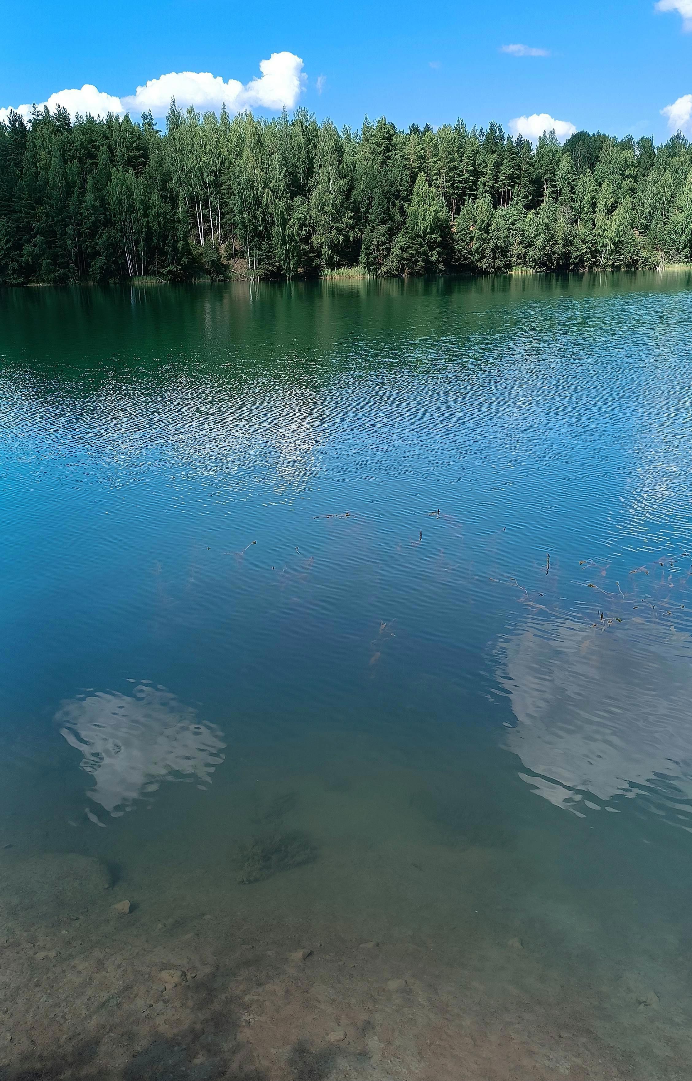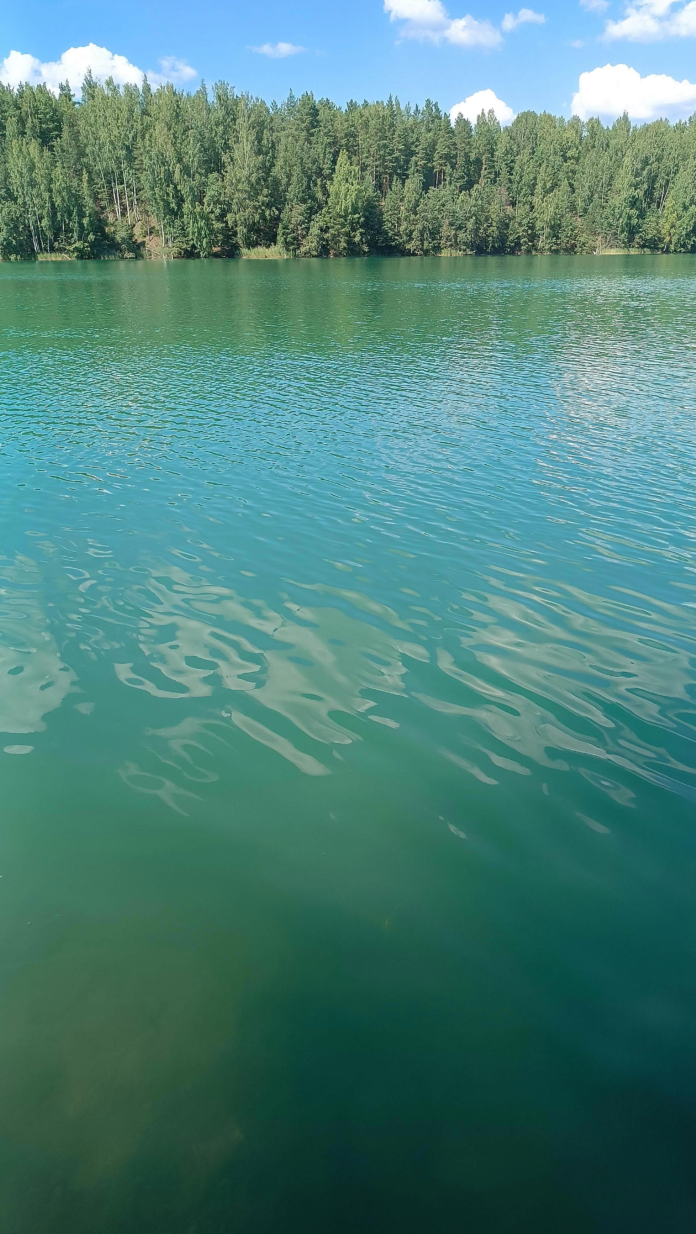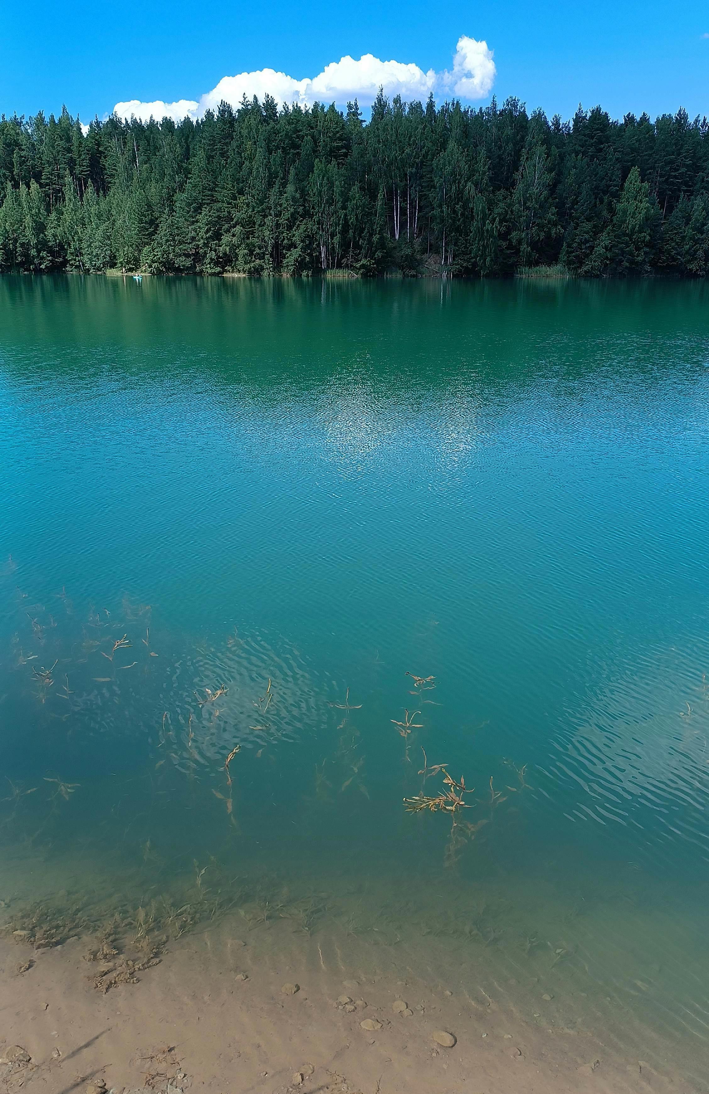 Чуть в сторону от реки Байковский карьер. Озеро очень глубокое. Вода действительно зелёная, потому что минерализованная. Чистая и прозрачная.